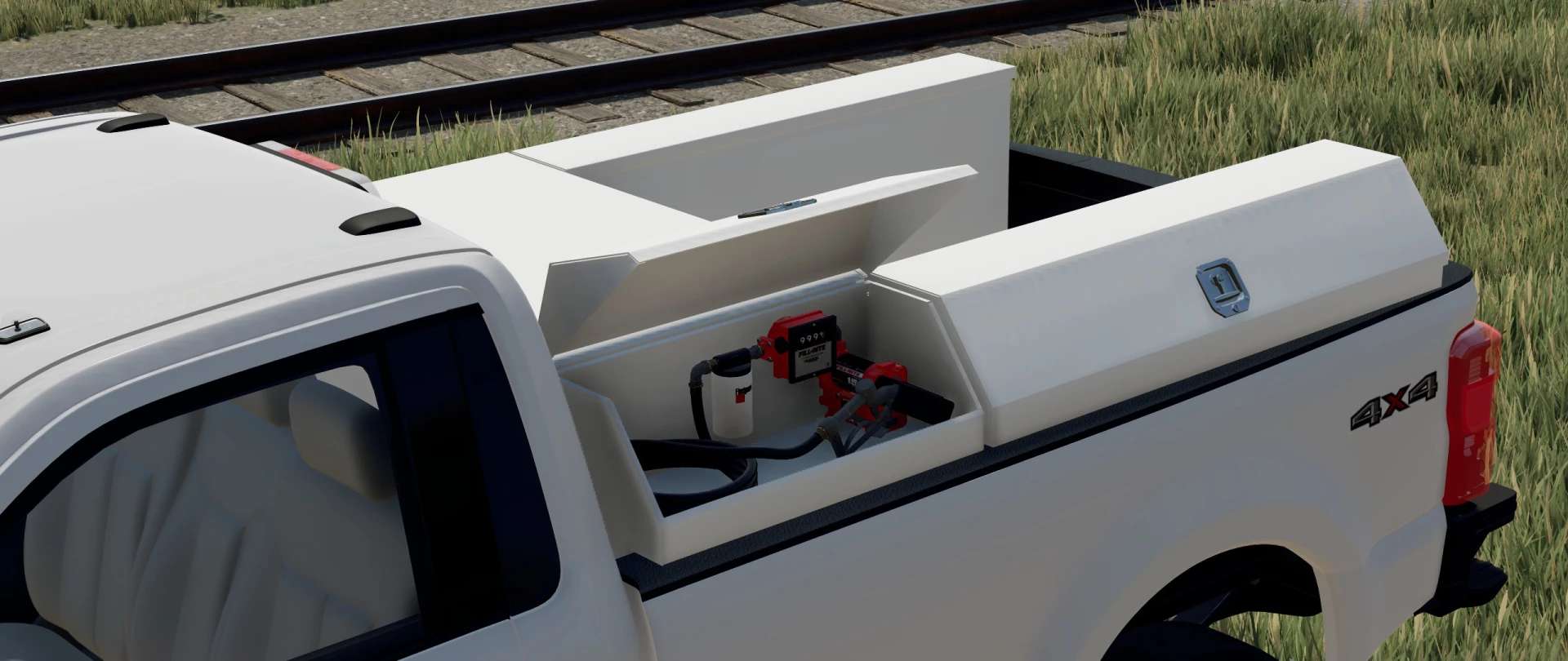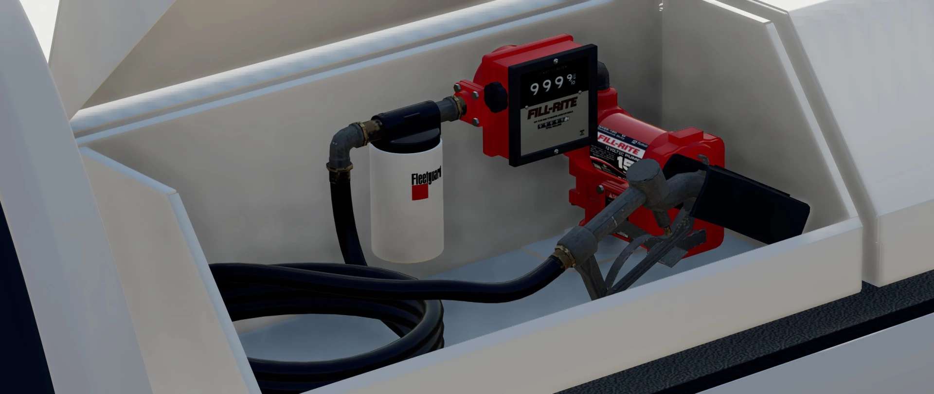 The fuel tank is filled on the passenger side, and you can refill equipment on the driver side.