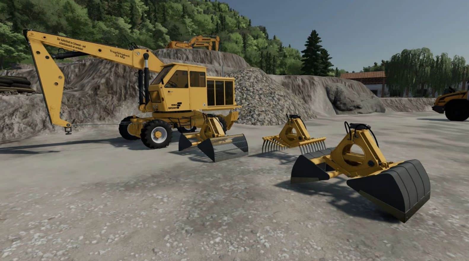 The excavator and accessories have been fully restored for FS22.
