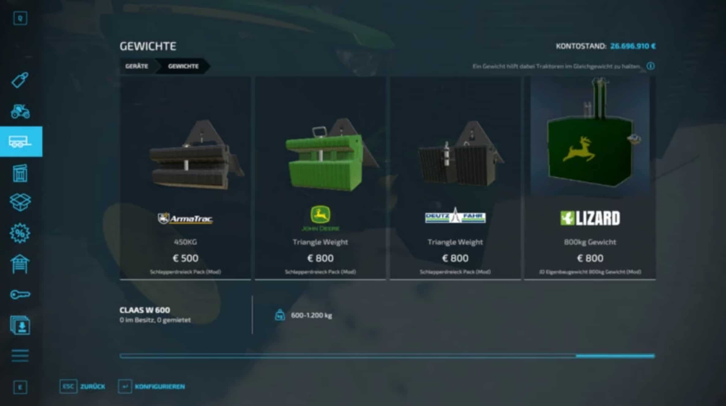 FS22 JD Eigenbaugewicht 800Kg Weight v1.0.0.0