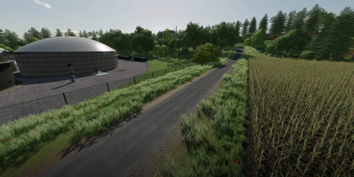 There is something for everyone when it comes to field shapes, as some fields are rectangular and others are very natural and curved in shape. The map was created for small to medium-sized farms and contains a lot of detail. In addition to agriculture, particular attention was paid to wine and olive cultivation and forestry. A poplar plantation was also established. In total there are 39 fields and four meadows. For all forest friends among you there are 23 forest plots. The cultivation of olives, vines and poplars was divided into 16 buyable plots. A total of 92 plots of land are available for purchase. In order to maintain the fun of the game, ten productions and six sales stations were installed. Selling points include the Bakery, Carpentry, Grain Factory, Dairy, Oil Manufacturing, Tailoring, Raisin Factory, Spinning, Grain Mill and Sugar Mill. You can sell your products at the country store, the farmer’s market, the sawmill, the biogas plant and the biomass heating plant. Collectibles were also installed.