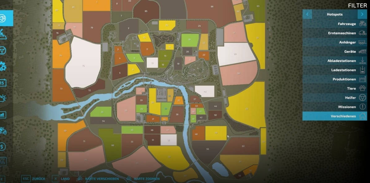 The map now has 99 fields (the largest has 50 ha), a Lohner main courtyard and 4 standard courtyards in the corners and also 4 BGA’s. There are also productions installed on the map that are visually larger on the one hand, but also have more bars (and cost). There is a large cow and sheep pasture for those of you who enjoy raising cattle. The top left fields are for grapes and the top right for olives (but don’t have to). Since the card is still in beta status, my clear recommendation is not to build anything further on it, because productions are still being added and existing products are being expanded. I installed a 4x fermenter/grass dryer at the hardware store, so 4 different players or farms can buy and use them here. No products can be sold in the productions, there are corresponding triggers for this, most of which have already been visually identified. There should also be no orders where stuff has to be carted into productions.