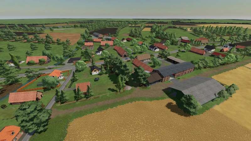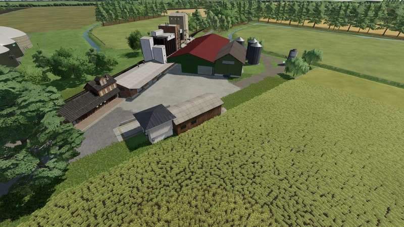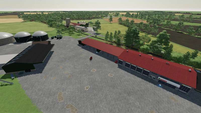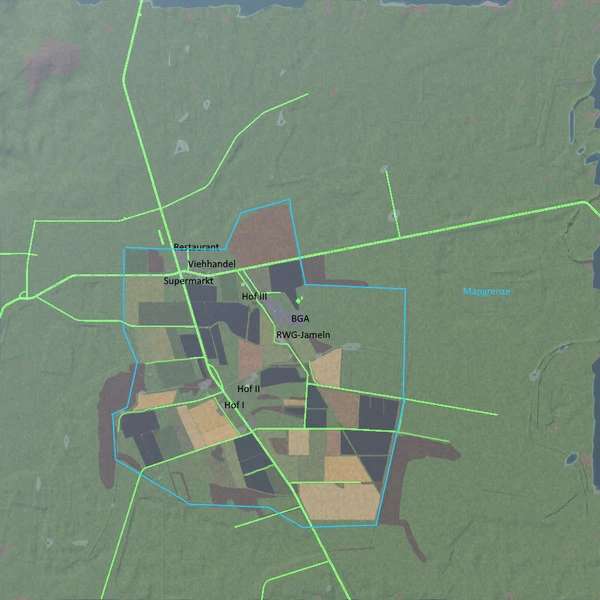 On the map are 4 sales station built and there are 4 farms. About 50 small to large fields you can already manage now. A cowshed is also already built as standard.