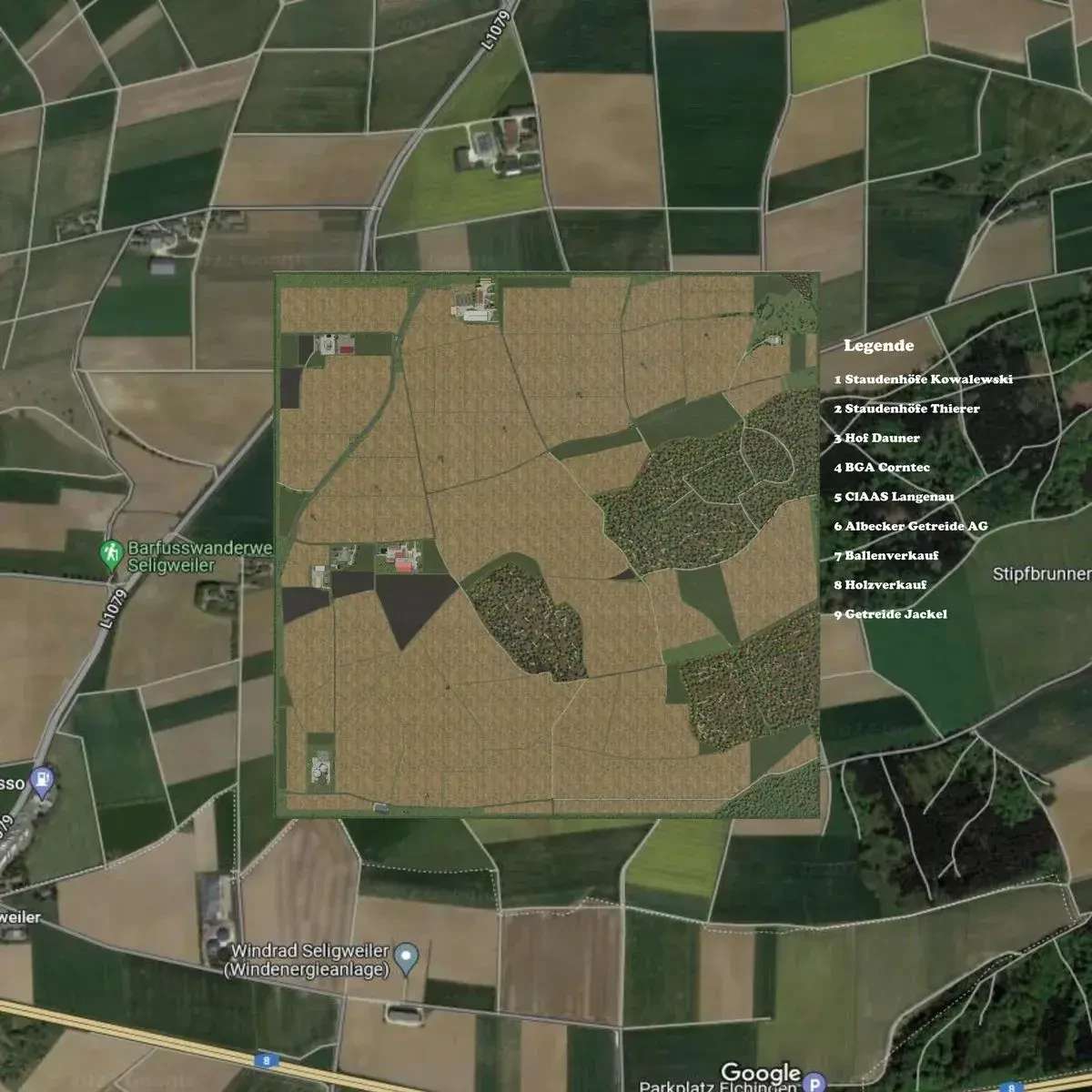 The map is based on a real replica, but some things could not be implemented exactly as in the original. There is no village on the map because they are purely resettler farms. The area can be found in GoggleMaps, just enter Rasthof Seligweiler and you will find it.
