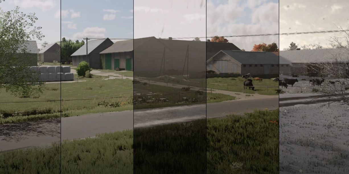 – Added seasonal decorations such as: leaves, snowmen, wet roads during rain, flooded meadows, Christmas lights on houses, artificial farmers in the field)