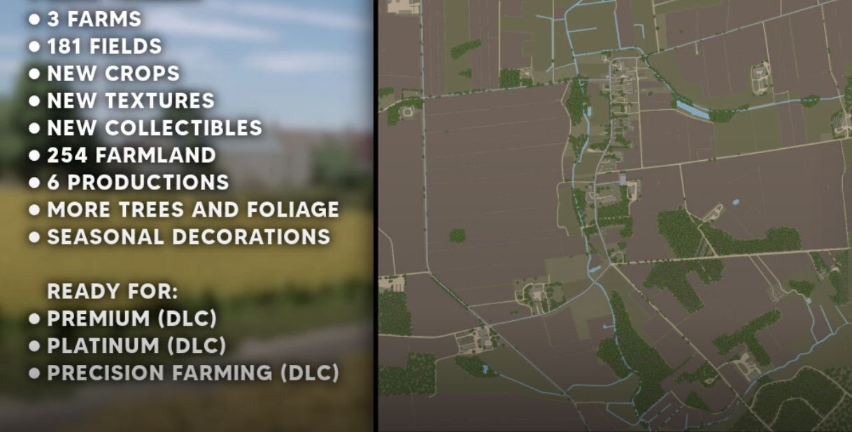– Added seasonal decorations such as: leaves, snowmen, wet roads during rain, flooded meadows, Christmas lights on houses, artificial farmers in the field)