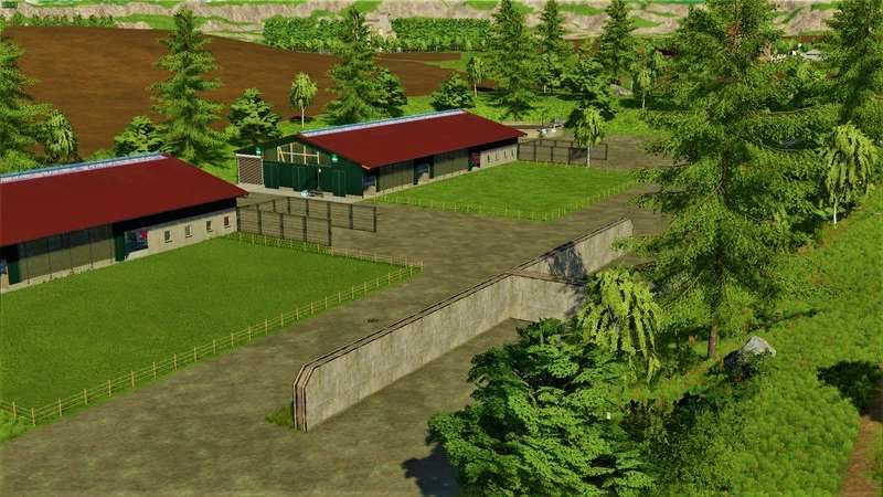 It offers 21 fields, including 4 meadows, 1 free-range pigsty, a cow yard and 1 sheepfold, 1 BGA, 4 sales points, 5 building areas and 4 forests.