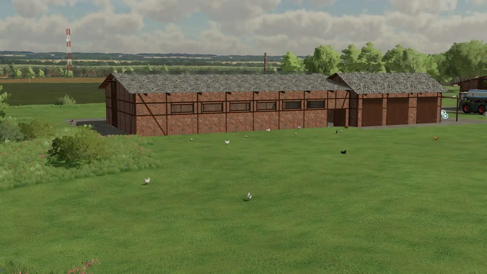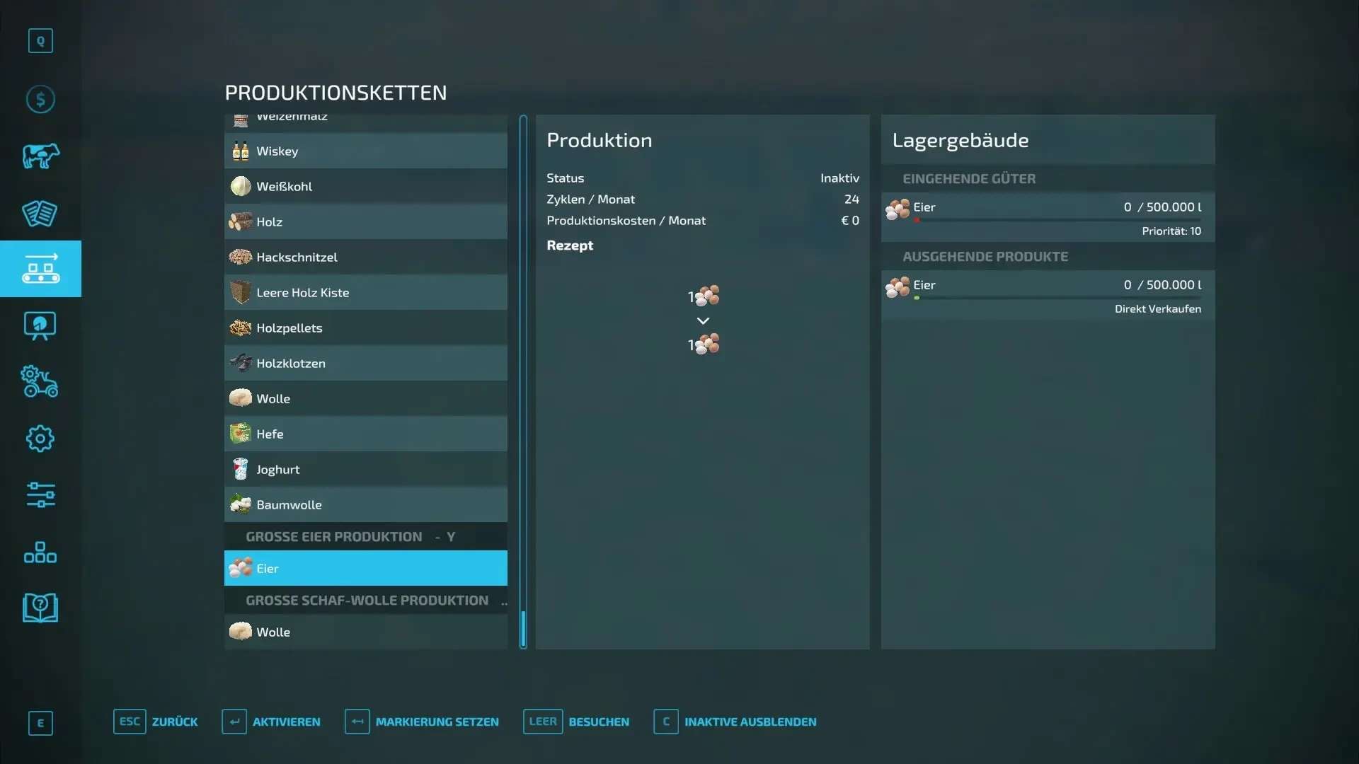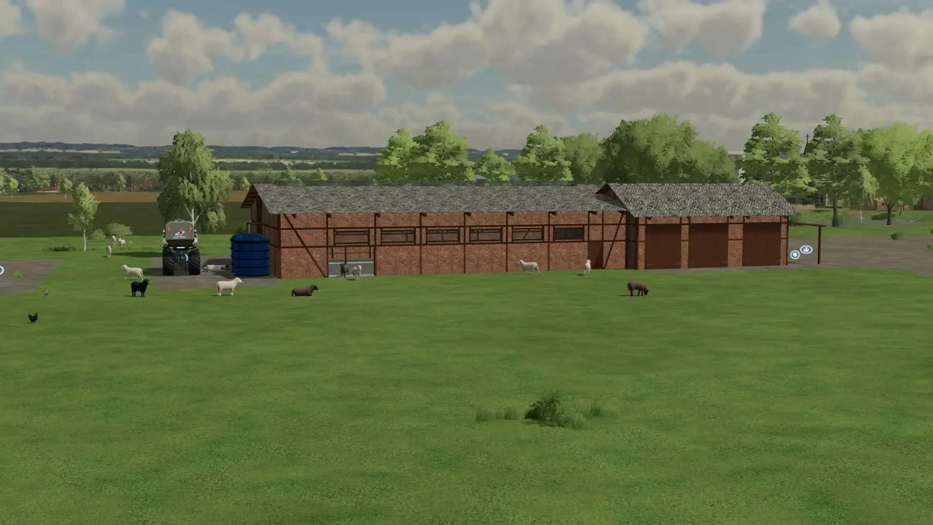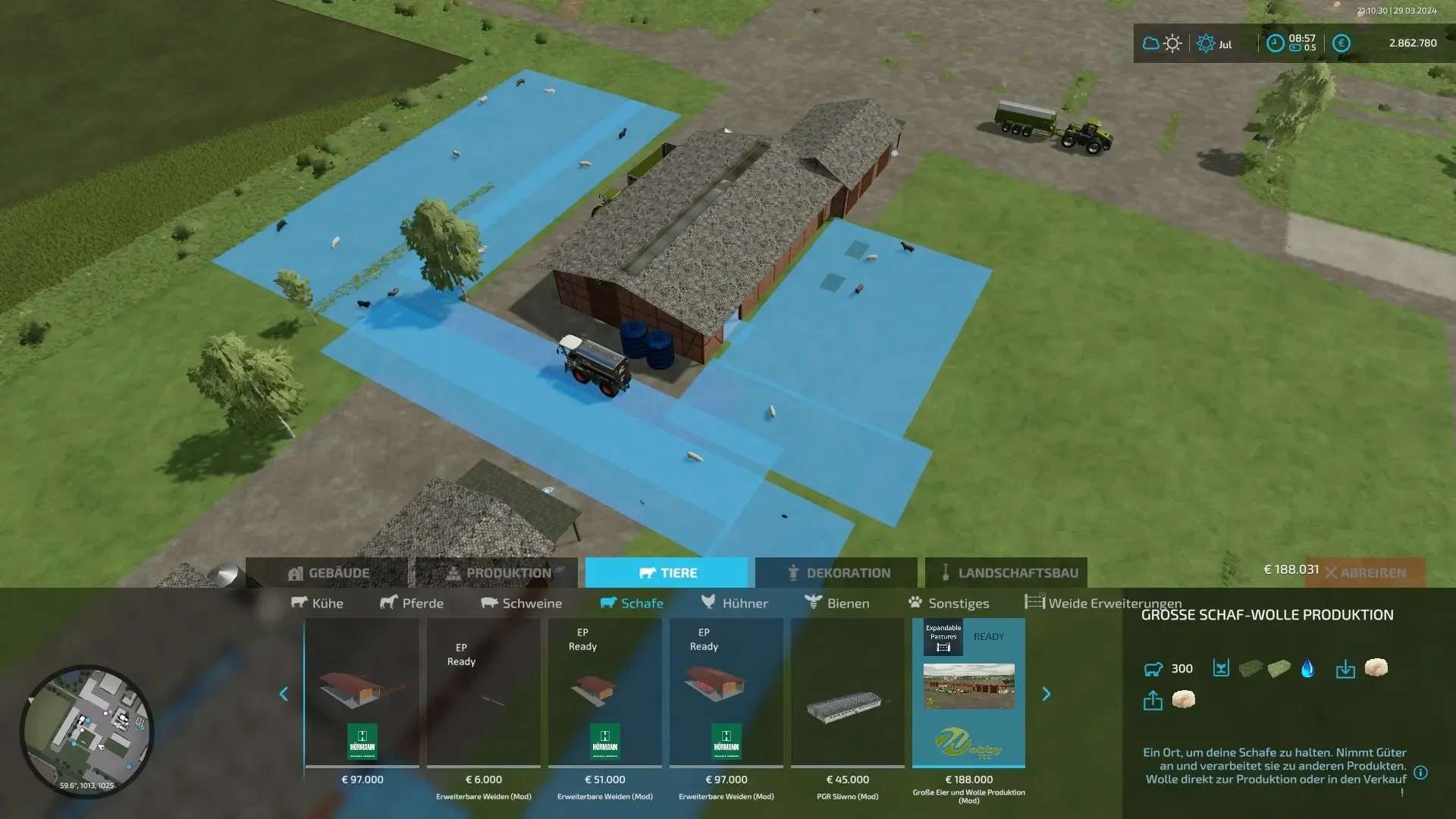 A chicken coop and a sheep coop as a production that gives eggs and wool directly to other productions, sells them directly, stores them or outsources them for transport with freely positionable pastures with and/or without fences or gates!