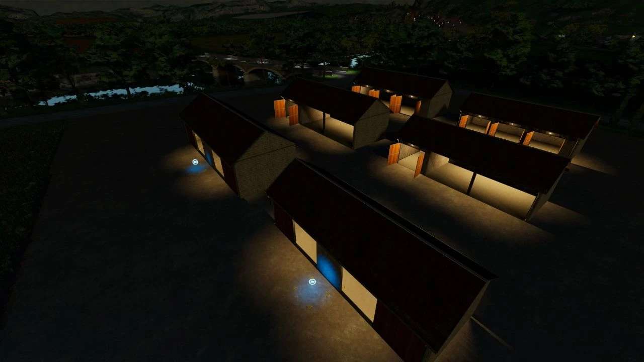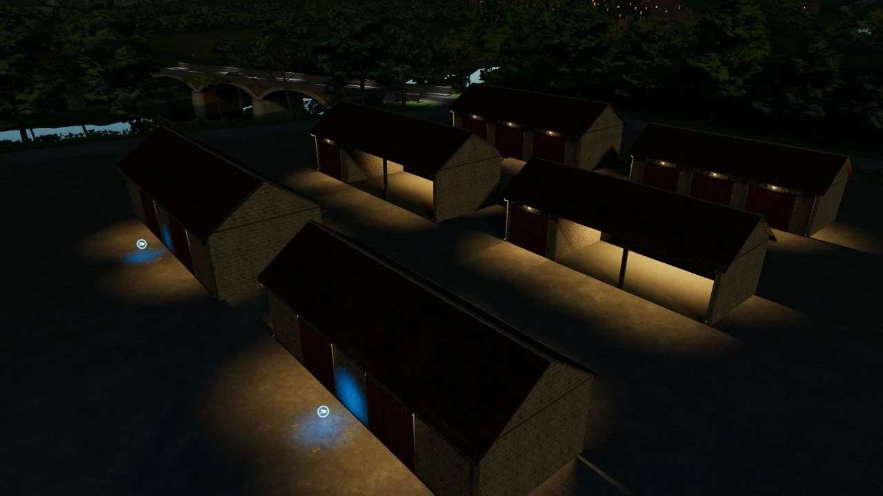 I present to you a set of farm buildings. The development includes a garage with three doors, a shed with a garage and a single gate, and a building for automatic storage of bales and pallets. The buildings are available in two versions, large and small. Automatic lighting after dark.