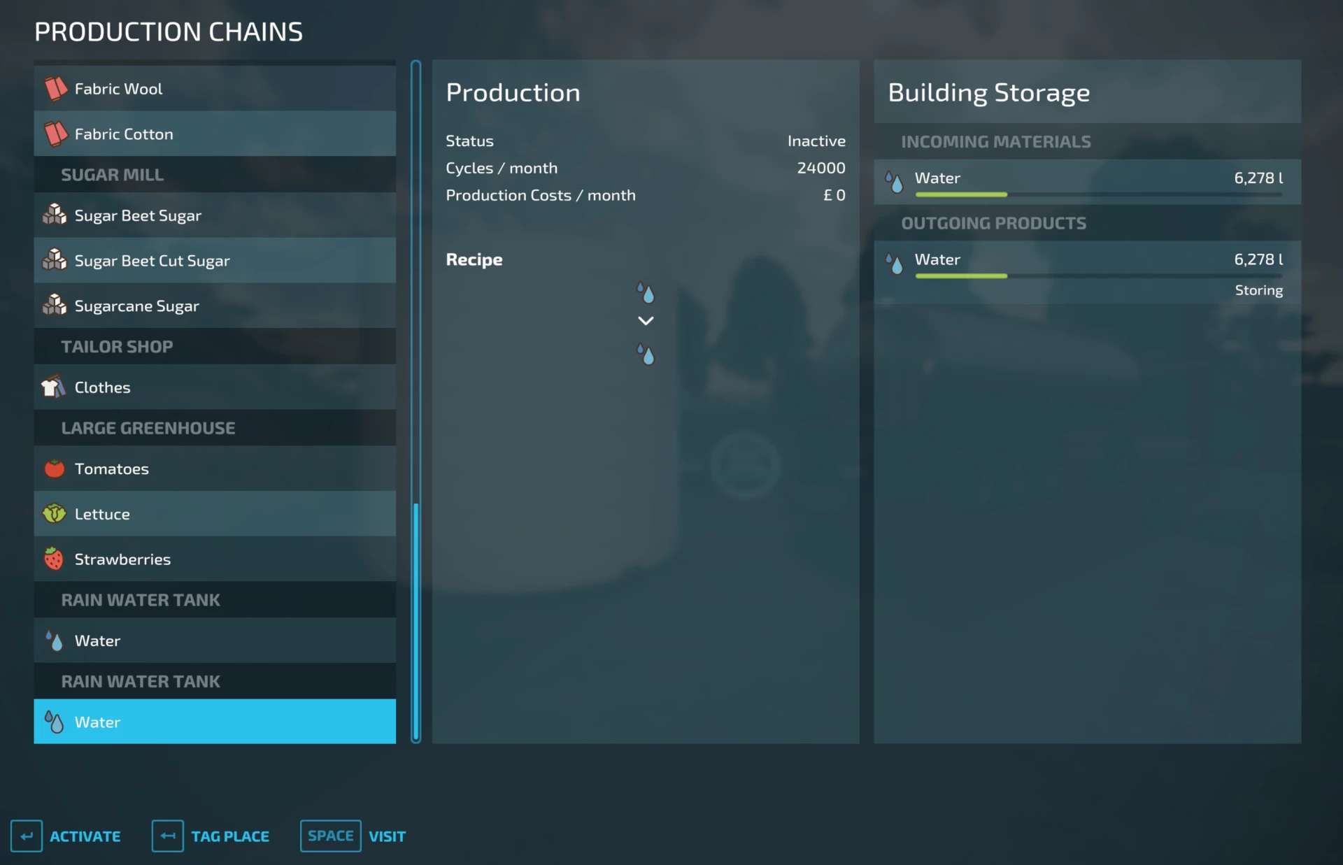 The water tank is created as a production rather than a silo, and will be found as a factory in the construction menu. However, the production does not require activating in order for it to work.