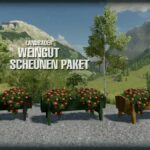 The winery barn package includes six different building variants and five different decorative objects. Three of the building variants are object warehouses for pallets that differ in appearance, the other three are pure storage or garage buildings without decorations. Since these are farm buildings, they are not free, unlike the decorative items, which are free as usual. The decorative items are three different flower troughs and two old oak barrels.