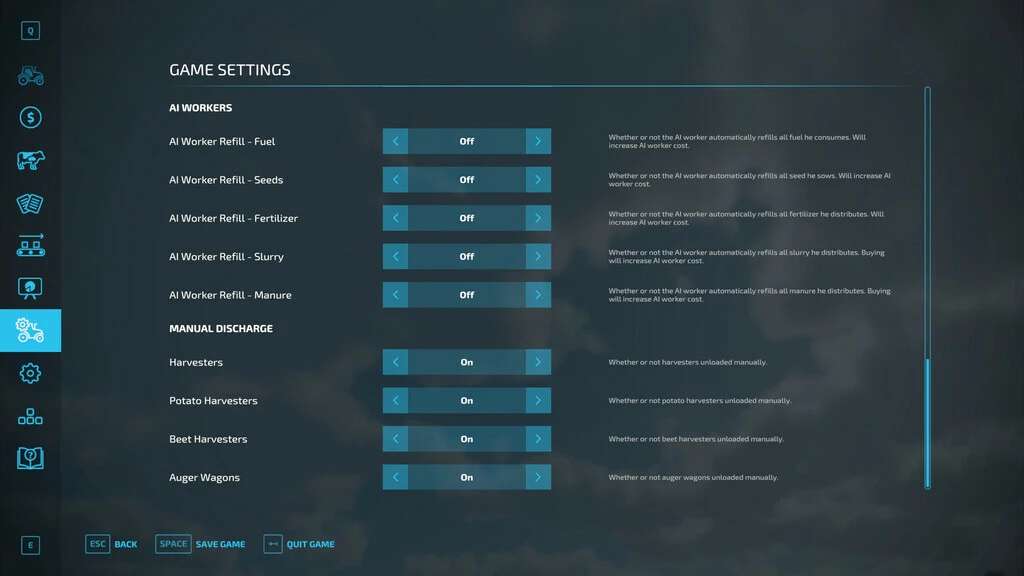 Thanks to this modification, the harvesters and auger wagons are unloaded manually by pressing the appropriate button. In the game settings, you can enable/disable manual unloading for specific machines.