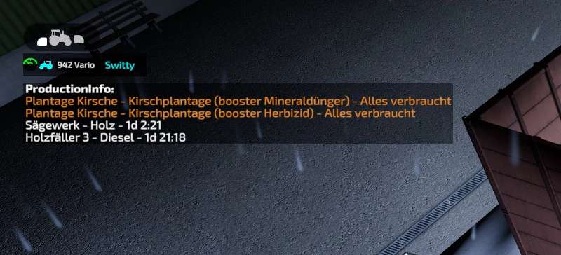 Display of active productions and animal sheds with their remaining time per resource. Including the animal sheds for feed, water and straw. Revamp Mix is also displayed as such.