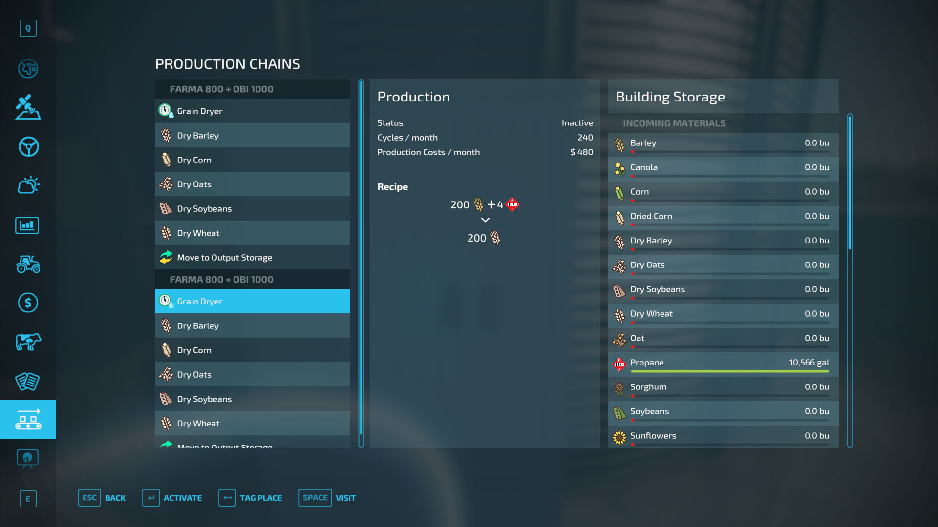 Most things can be done inside the vanilla productions menu. The rest is controlled from the placeable i3d embedded control trigger. This trigger is the same as a player trigger for a production placeable. Standing in the trigger will bring up the controls and show extended information in the player hud box.
