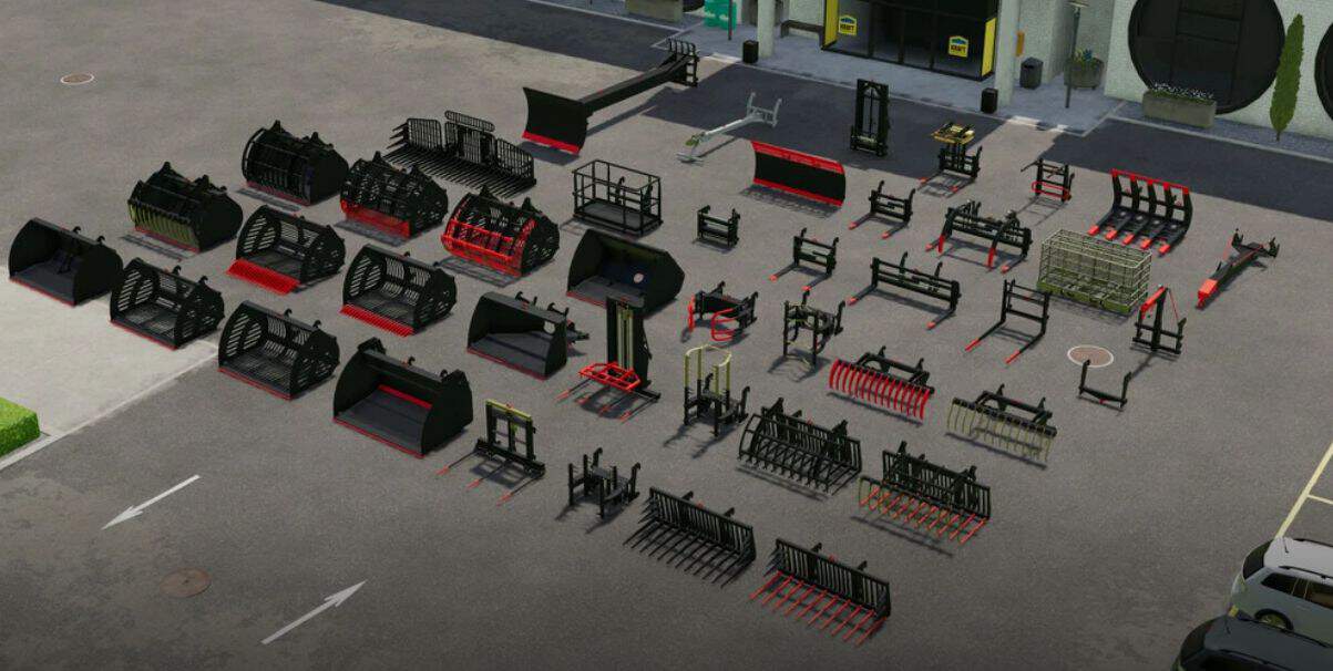 silage bucket, bucket for potatoes and beets, normal bucket, bucket with grapple, raptor bucket, bucket with central exhaust, bale fork, manure fork, fork with grapple, big fork, fork for wrapped bales, biting fork, big bag handler, extension cord, adapters, translator, extra elevation, pallet fork, fork carriage for smart stack cages, pallet fork with grapple, double pallet fork, fork for logs, log shovel, hook for lifting, arm for the lift, extension for lifting, scraper, dozer blade with extension.
