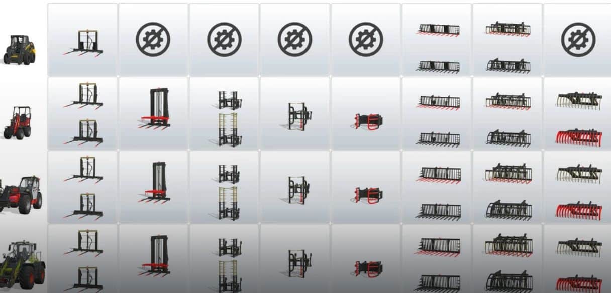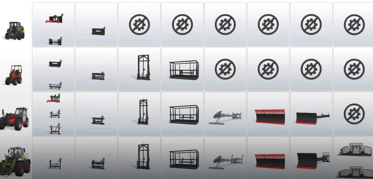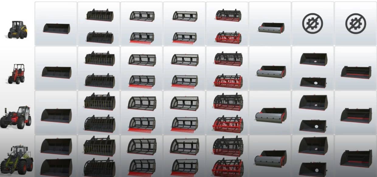 silage bucket, bucket for potatoes and beets, normal bucket, bucket with grapple, raptor bucket, bucket with central exhaust, bale fork, manure fork, fork with grapple, big fork, fork for wrapped bales, biting fork, big bag handler, extension cord, adapters, translator, extra elevation, pallet fork, fork carriage for smart stack cages, pallet fork with grapple, double pallet fork, fork for logs, log shovel, hook for lifting, arm for the lift, extension for lifting, scraper, dozer blade with extension.