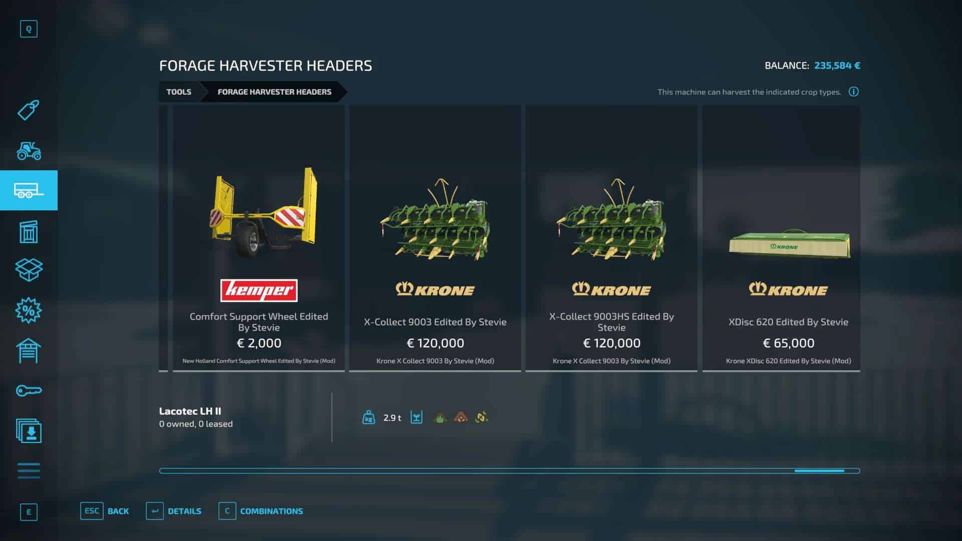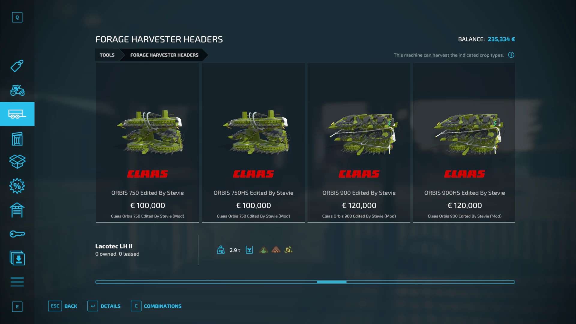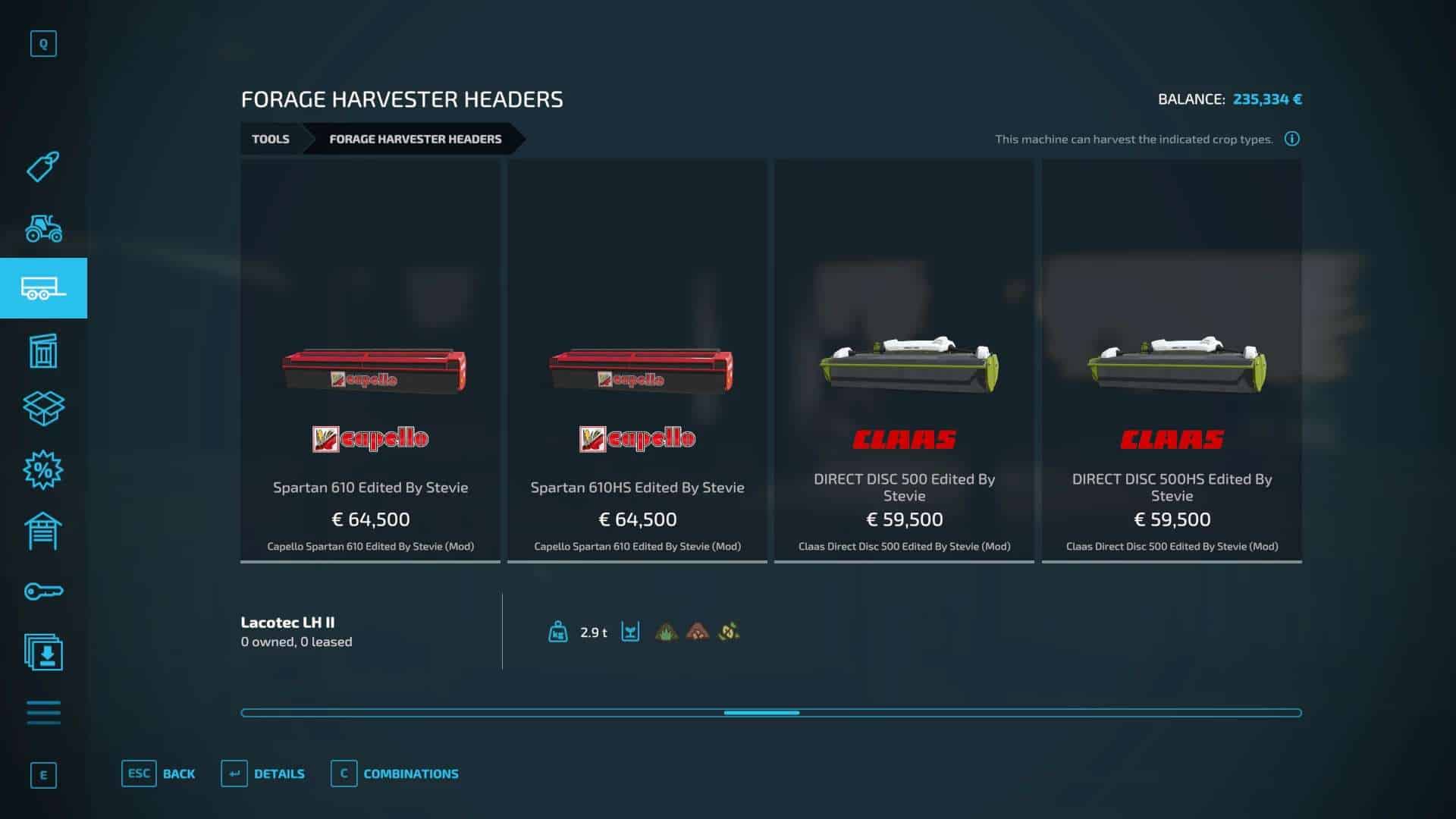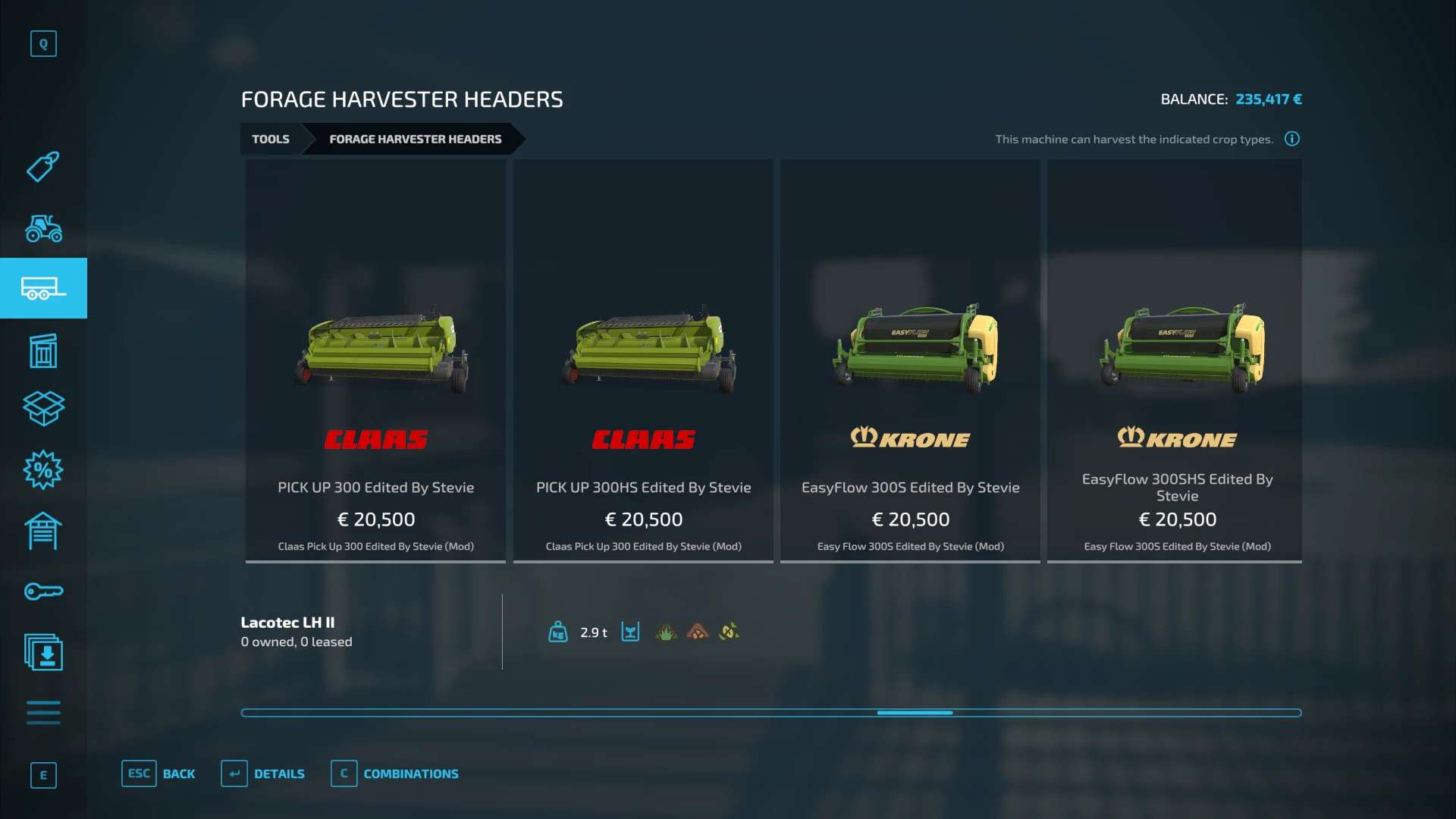 Fendt 300, Krone BigX 1180, Buehrer 6195, Capello Helianthus 5700, Capello Helianthus 12000, Capello Sparton. Case IH Maxxum, Claas Direct Disc 500, Claas Jaguar 980, Claas Orbis 750, Class Orbis 900, Claas Jaguar 960, Claas Pickup 300, Claas Torion 1511, Claas Torion 1914, Deutz Topliner with cutter and trailer, Krone Easyflow 300, JCB Fastrac 4220, Fendt 200v Vario, Fendt Katana 650, GA15131, Iseki TJV985, JCB Fastrac 8330, JD 6M, JD 9000, JD 5M, JD 710, Kemper 345Plus, Kemper 360Plus, Kemper 390Plus, Kemper 3003, Krone BigX 580, Landini Rex, Lanco LH11, Lidner Lintrac, Man TGX Autoloading Flatbed, New Holland 130FB, NH Support Wheel, NH T6, NH TK4, NH FR780, Power Stream 500, Nova 330E, SIP Air300, SIP Favorit254, SKE 50, Stara Imperador 3, Valtra G Series, Vicon Fanex 904, Krone Xcollect 9003, Krone Xdisc 620 and trailer, Z2810H, Zetor Forterra HSx, Zetor Major CL and Zetor Proxima HS.