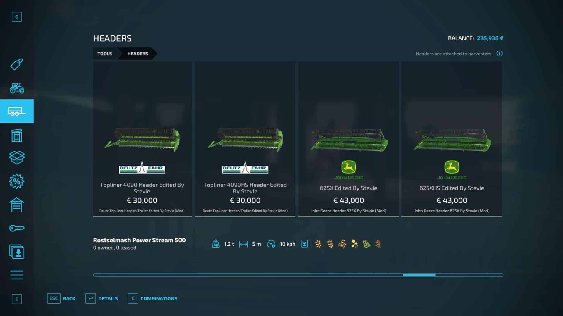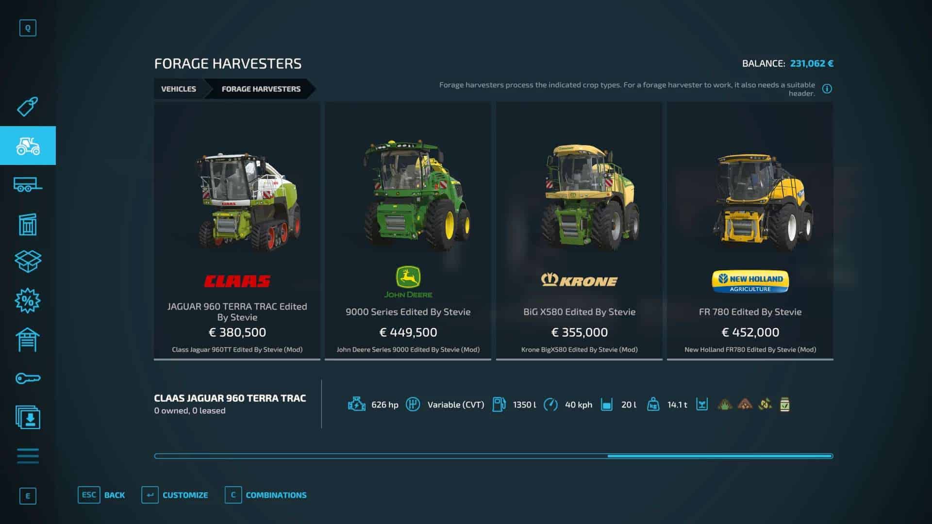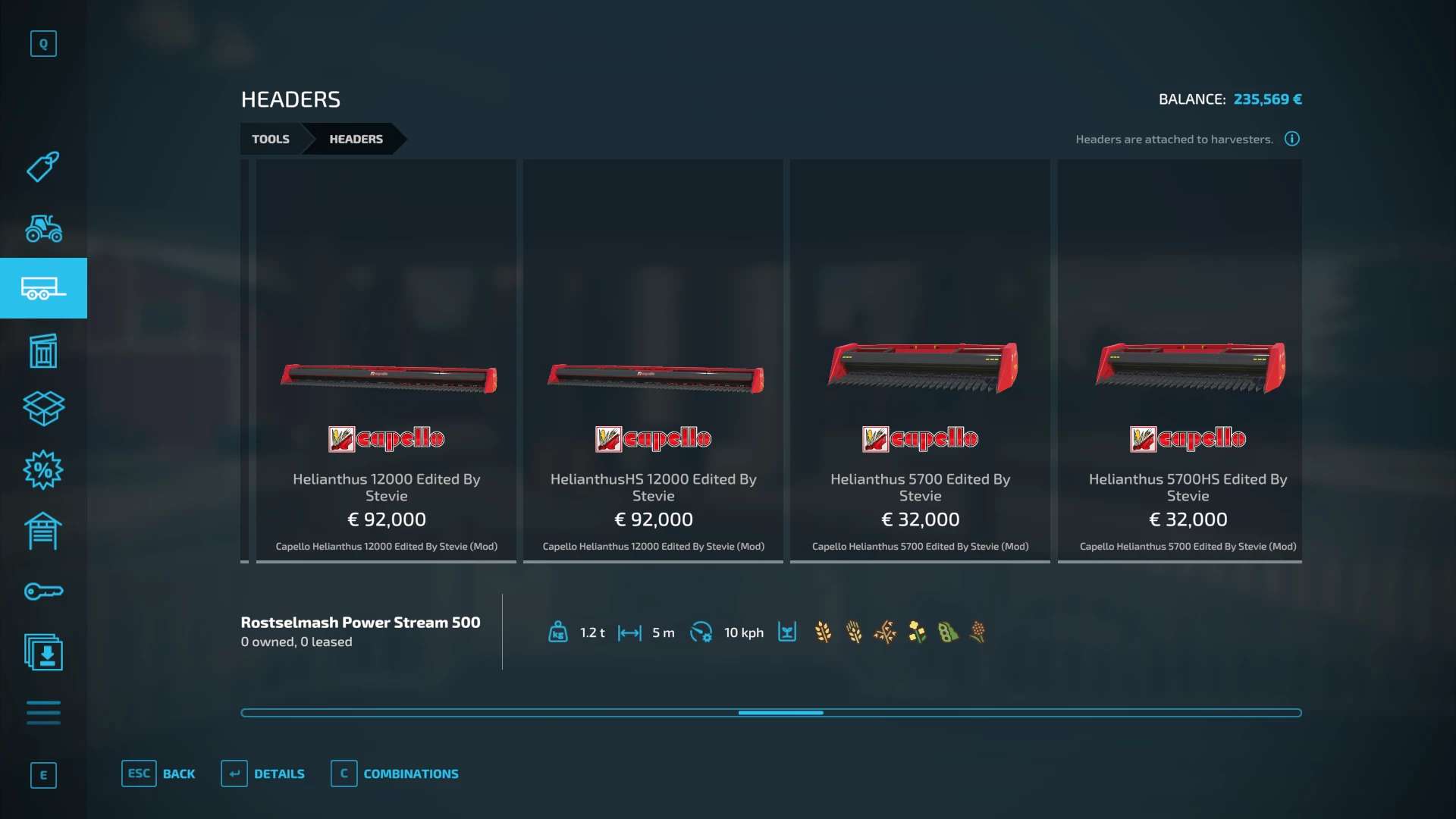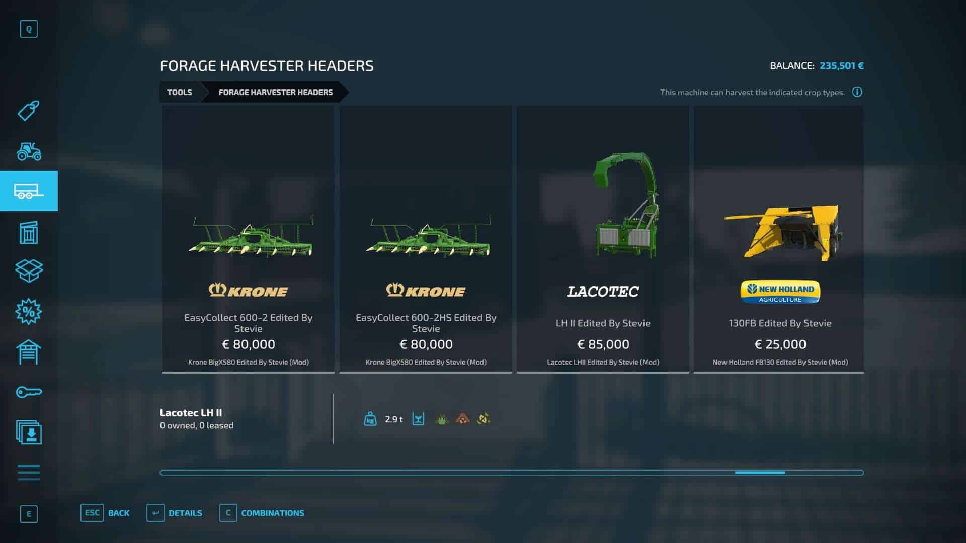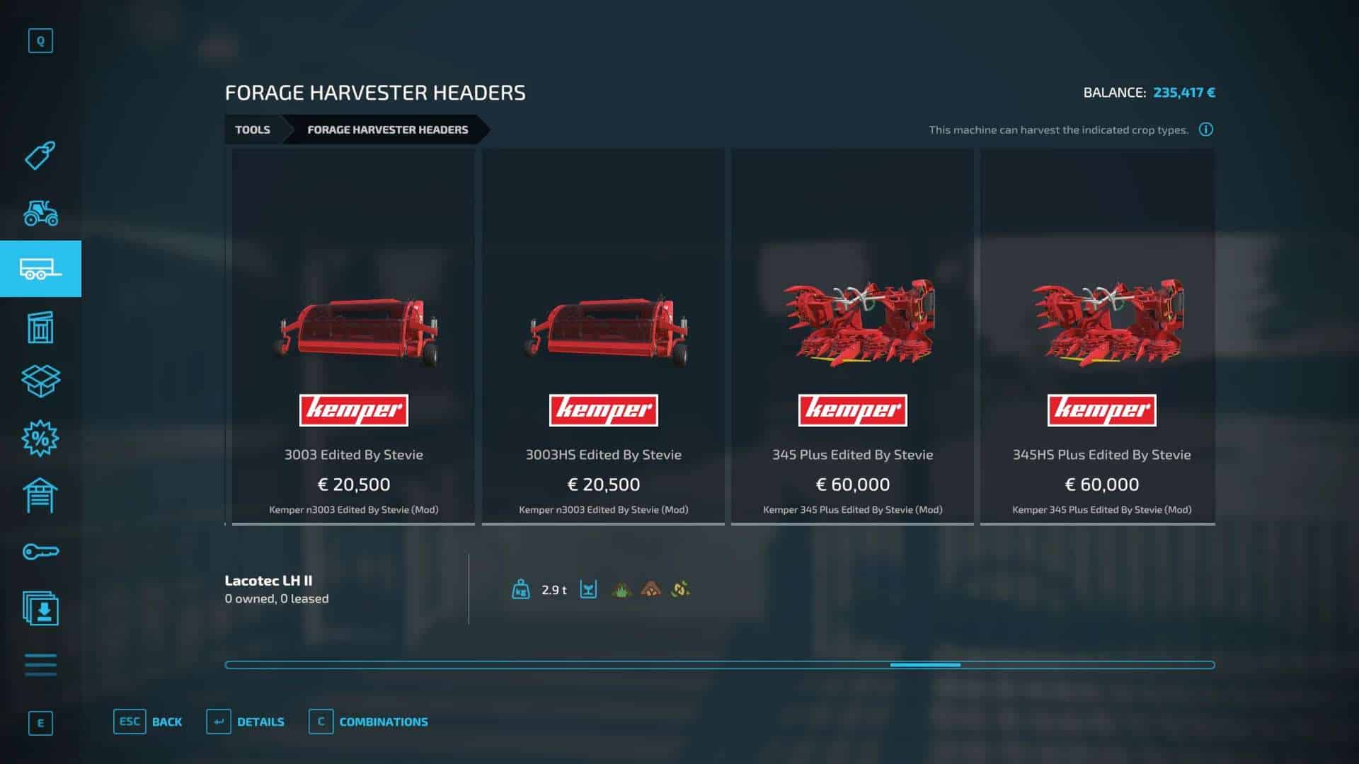 Fendt 300, Krone BigX 1180, Buehrer 6195, Capello Helianthus 5700, Capello Helianthus 12000, Capello Sparton. Case IH Maxxum, Claas Direct Disc 500, Claas Jaguar 980, Claas Orbis 750, Class Orbis 900, Claas Jaguar 960, Claas Pickup 300, Claas Torion 1511, Claas Torion 1914, Deutz Topliner with cutter and trailer, Krone Easyflow 300, JCB Fastrac 4220, Fendt 200v Vario, Fendt Katana 650, GA15131, Iseki TJV985, JCB Fastrac 8330, JD 6M, JD 9000, JD 5M, JD 710, Kemper 345Plus, Kemper 360Plus, Kemper 390Plus, Kemper 3003, Krone BigX 580, Landini Rex, Lanco LH11, Lidner Lintrac, Man TGX Autoloading Flatbed, New Holland 130FB, NH Support Wheel, NH T6, NH TK4, NH FR780, Power Stream 500, Nova 330E, SIP Air300, SIP Favorit254, SKE 50, Stara Imperador 3, Valtra G Series, Vicon Fanex 904, Krone Xcollect 9003, Krone Xdisc 620 and trailer, Z2810H, Zetor Forterra HSx, Zetor Major CL and Zetor Proxima HS.