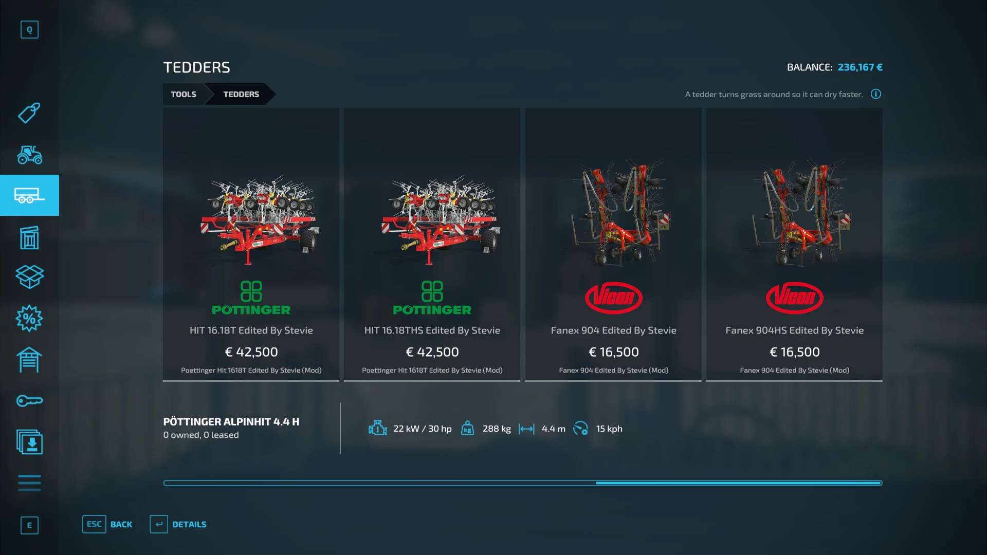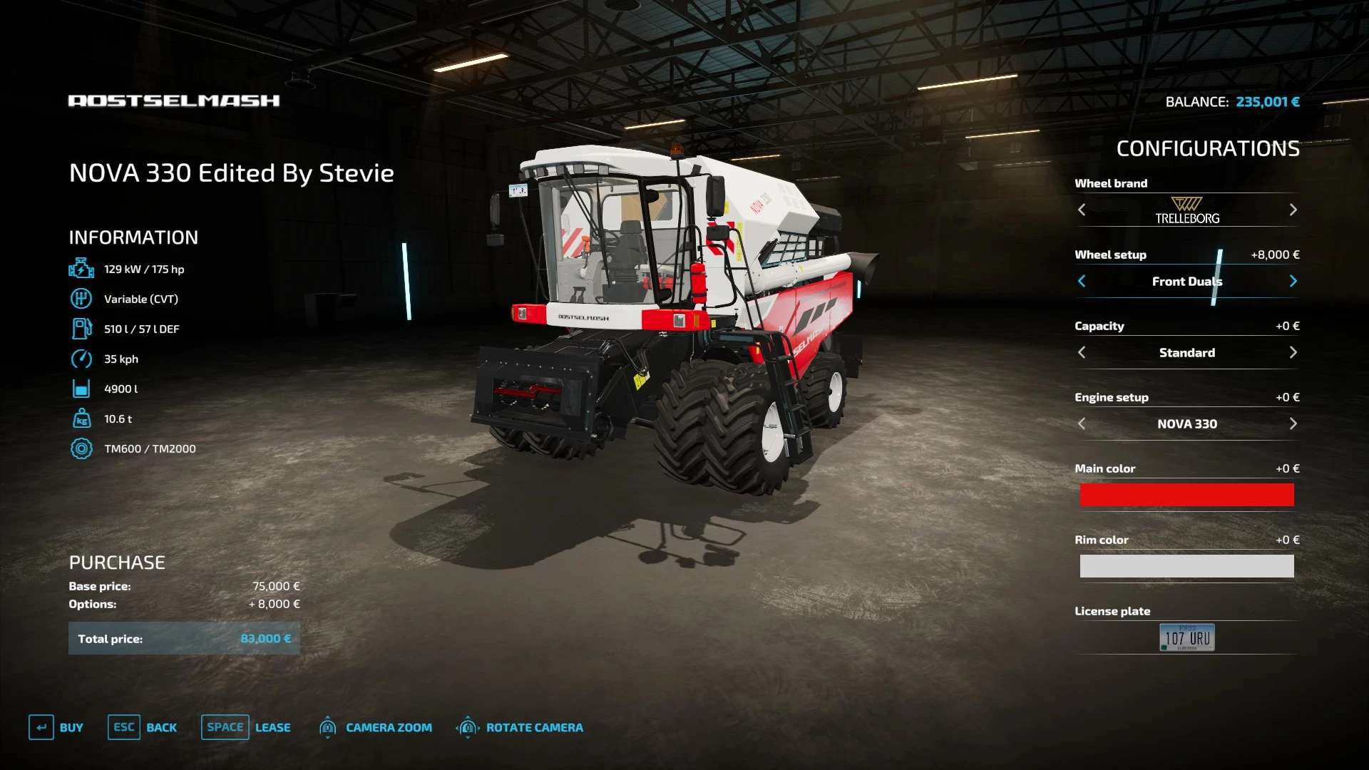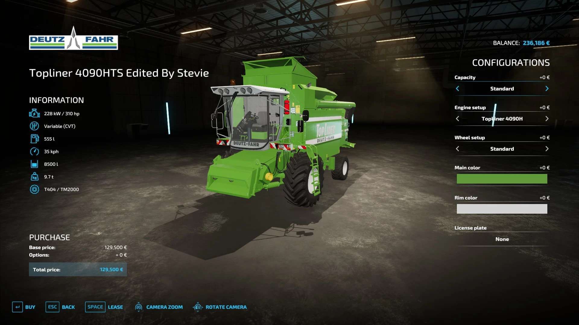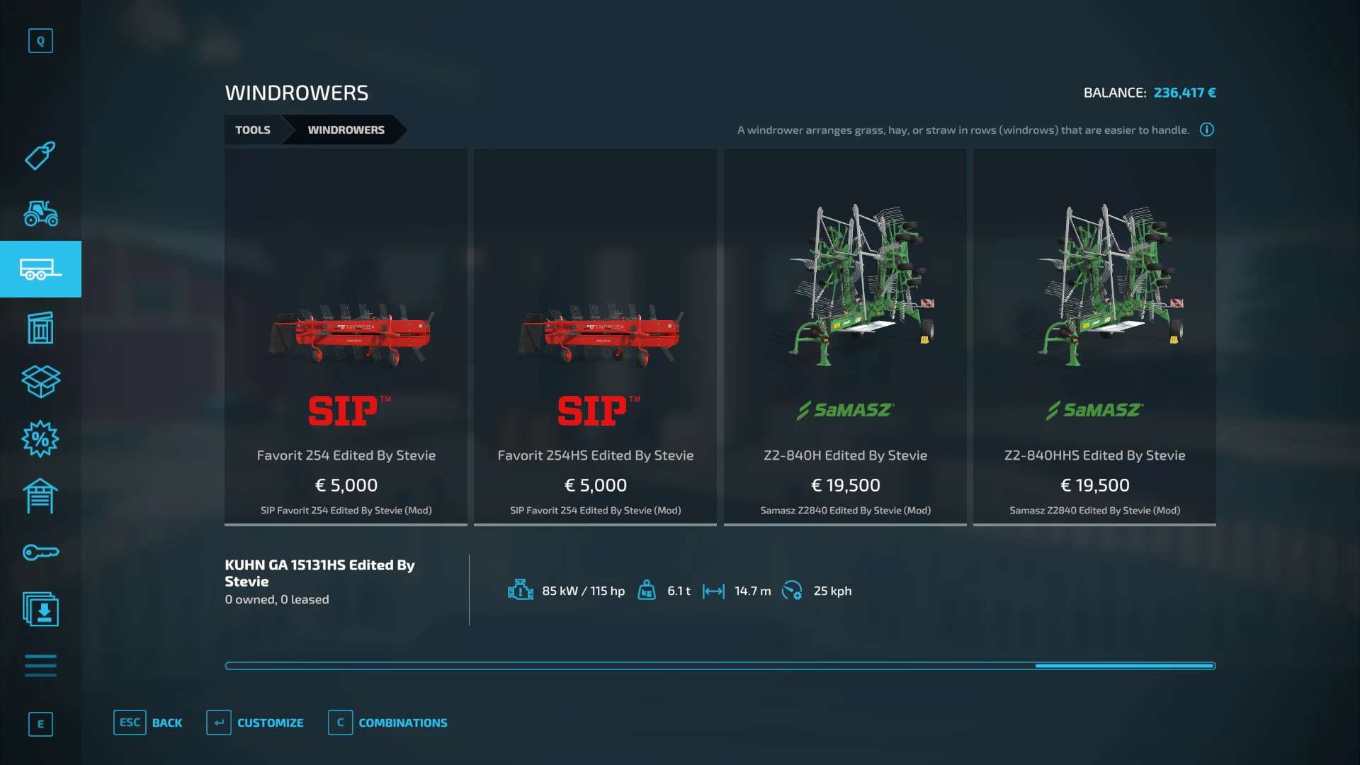 Fendt 300, Krone BigX 1180, Buehrer 6195, Capello Helianthus 5700, Capello Helianthus 12000, Capello Sparton. Case IH Maxxum, Claas Direct Disc 500, Claas Jaguar 980, Claas Orbis 750, Class Orbis 900, Claas Jaguar 960, Claas Pickup 300, Claas Torion 1511, Claas Torion 1914, Deutz Topliner with cutter and trailer, Krone Easyflow 300, JCB Fastrac 4220, Fendt 200v Vario, Fendt Katana 650, GA15131, Iseki TJV985, JCB Fastrac 8330, JD 6M, JD 9000, JD 5M, JD 710, Kemper 345Plus, Kemper 360Plus, Kemper 390Plus, Kemper 3003, Krone BigX 580, Landini Rex, Lanco LH11, Lidner Lintrac, Man TGX Autoloading Flatbed, New Holland 130FB, NH Support Wheel, NH T6, NH TK4, NH FR780, Power Stream 500, Nova 330E, SIP Air300, SIP Favorit254, SKE 50, Stara Imperador 3, Valtra G Series, Vicon Fanex 904, Krone Xcollect 9003, Krone Xdisc 620 and trailer, Z2810H, Zetor Forterra HSx, Zetor Major CL and Zetor Proxima HS.