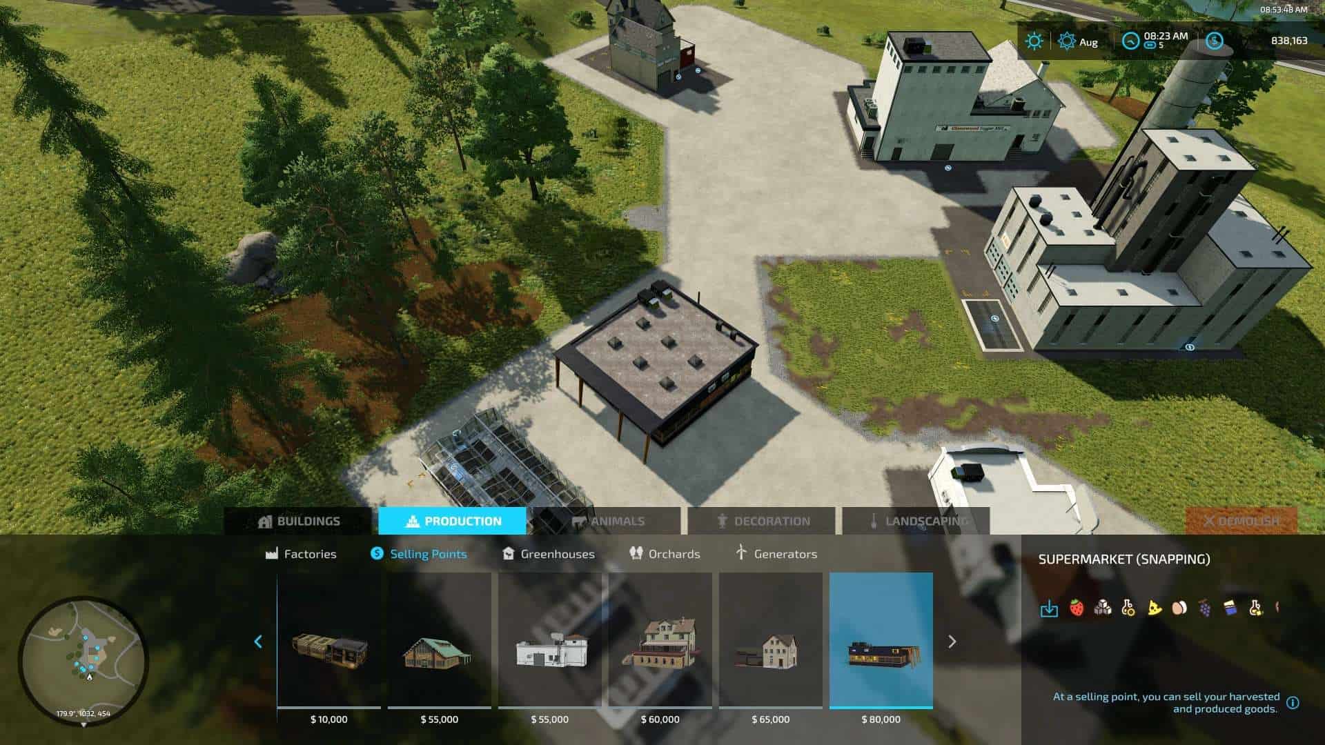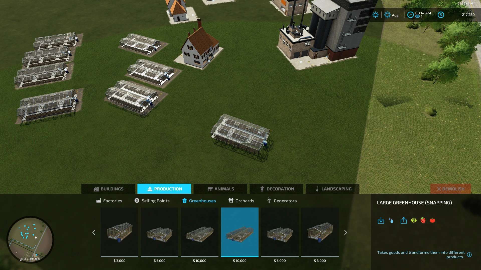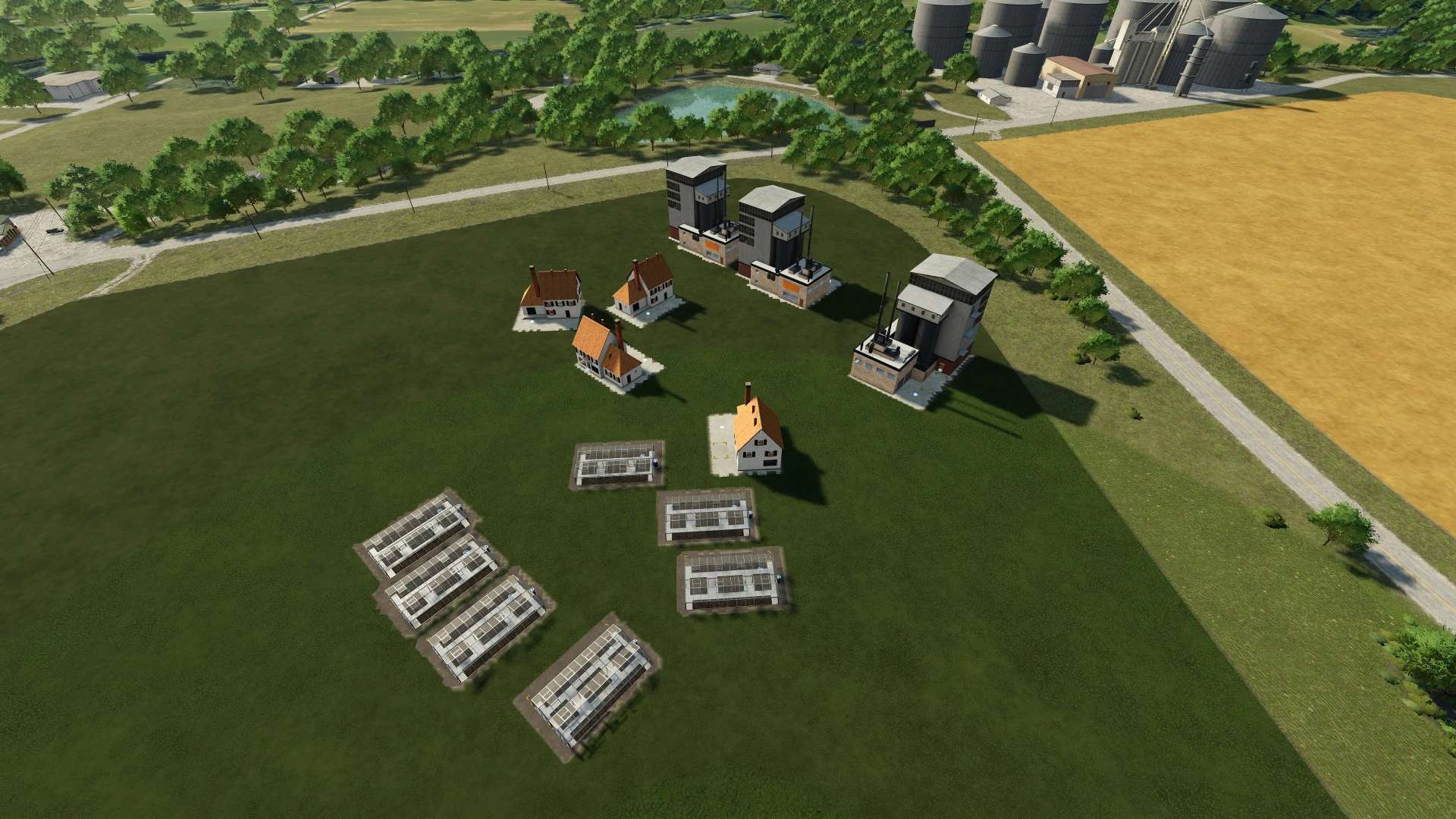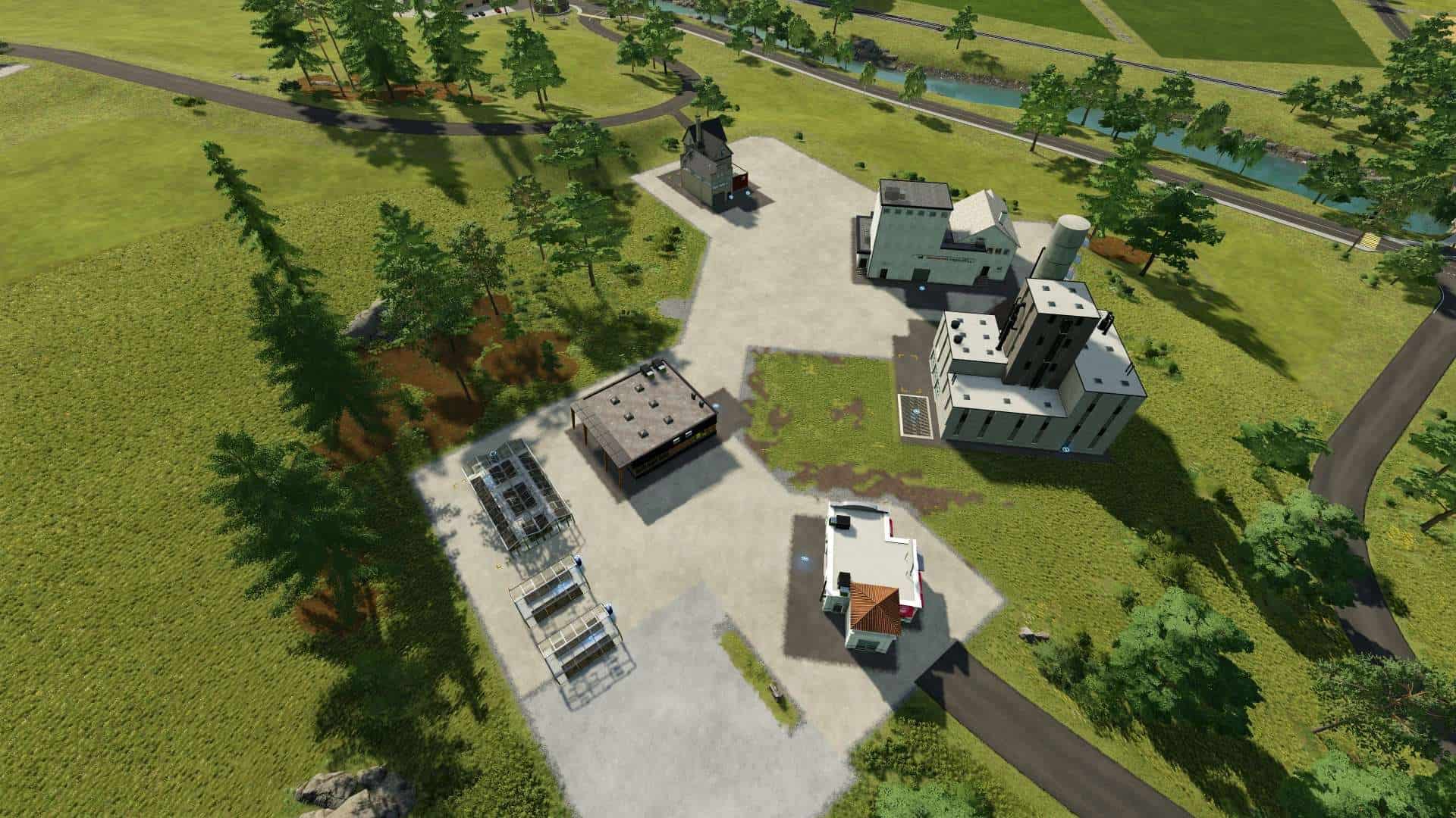 This mod pack for Farming Simulator 22 features the base game production buildings but set to snap at 45 degree angle rotations only.