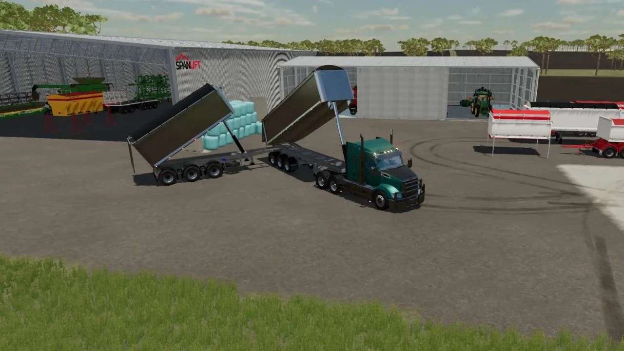 Unload speed varies with capacity choice. Fully animated roll-back tarps. Orange and red side markers (thanks Jay).