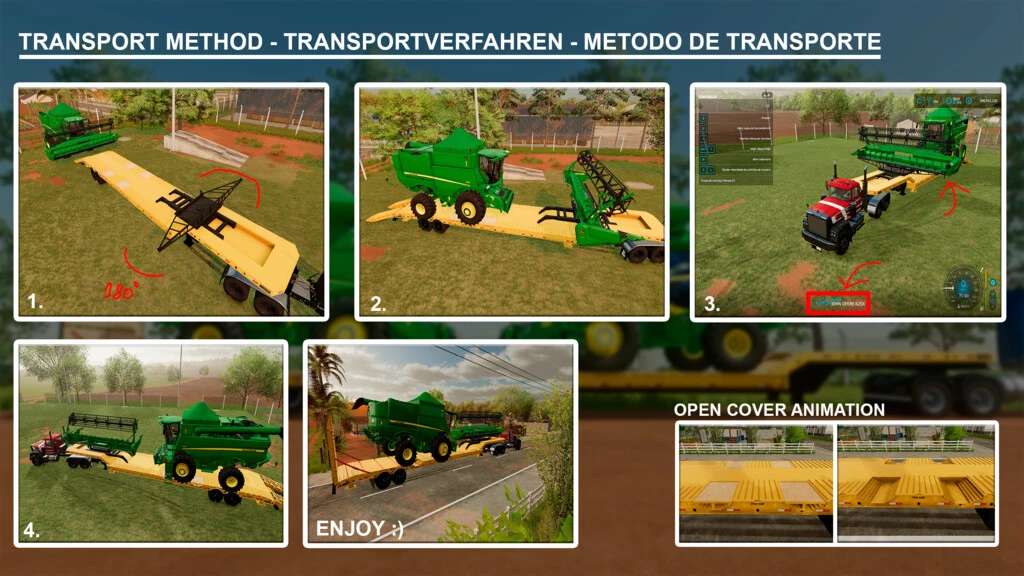To use the cutterbar support (Illustration in Screenshot 2), on the truck you must lower the ramp, rotate and move the cutterbar support backwards. After that, get on the trailer with the harvester still engaged with its cutterbar, get on top of the support and disengage it there. Move the combine backwards a little, get in the truck and the function To couple will appear, after coupling you will rotate the support and leave it in the position close to the trailer. After that it will be working.