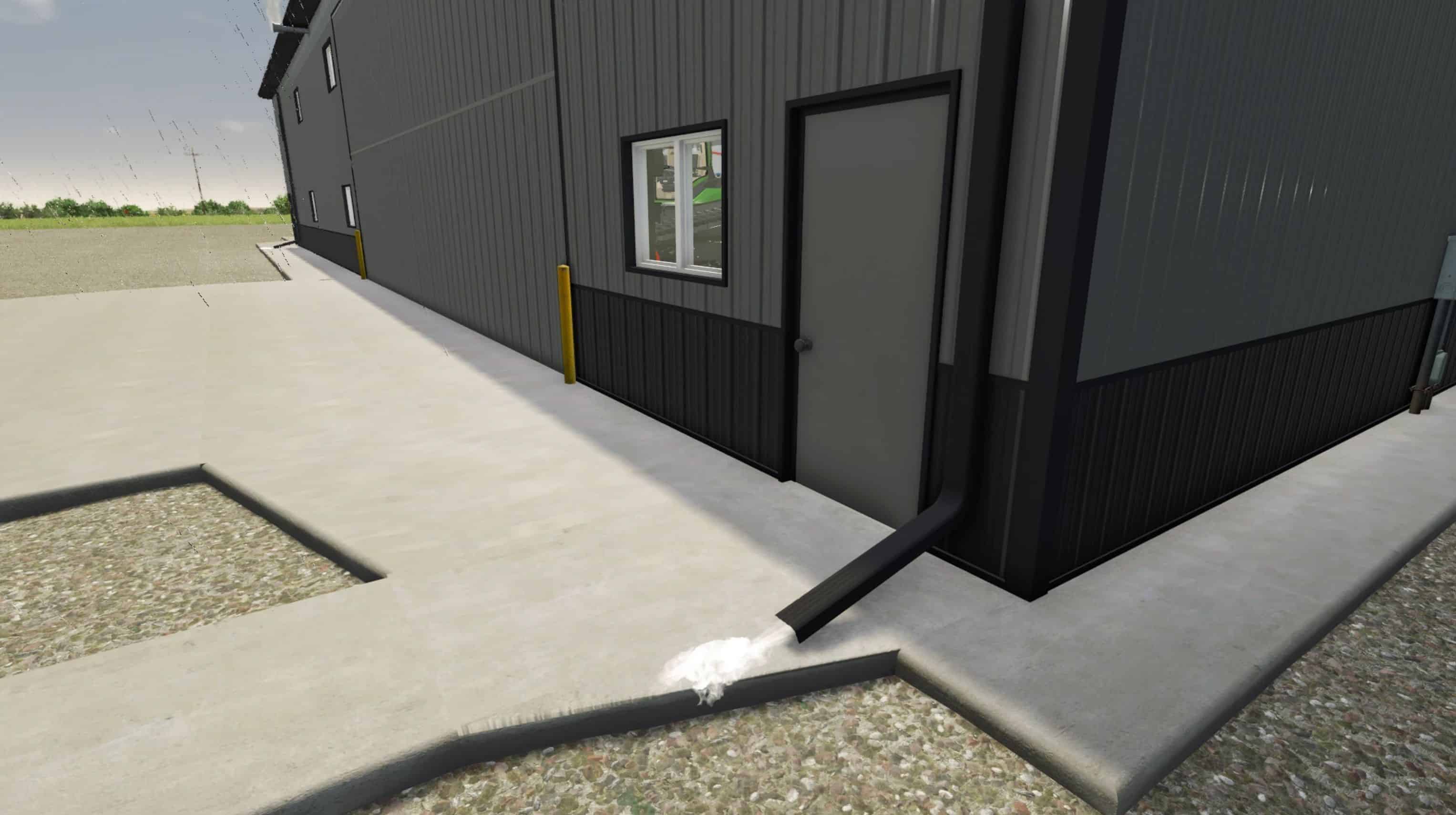 Not much has changed on this shop, everything has been converted over to FS25, outside tin and windows get wetness on them when it rains, neat little feature, also I had an Idea for the downspouts, so when it rains you will see water running out the downspouts (pictures of it in this post ), but Legacy Ag was the one who took my idea and actually made it come to life on the buildings, so that credit goes to him. You will see it on all our FS 25 buildings as we strive to bring you some of the best buildings in FS, we don’t rush stuff to just get it out, quality takes time and I hope you can appreciate that.