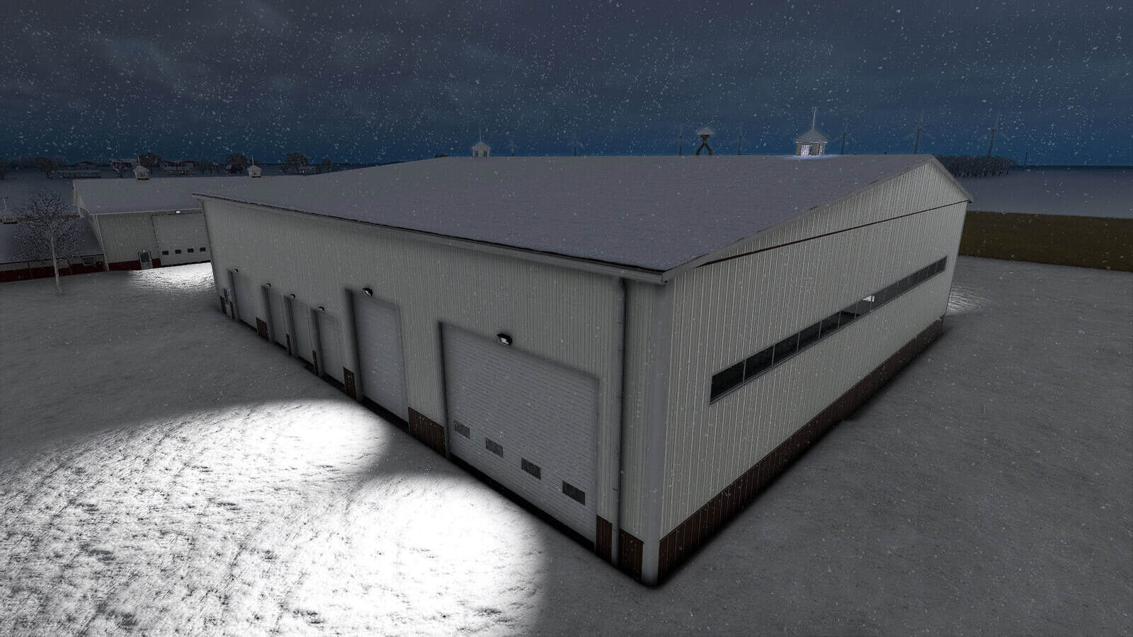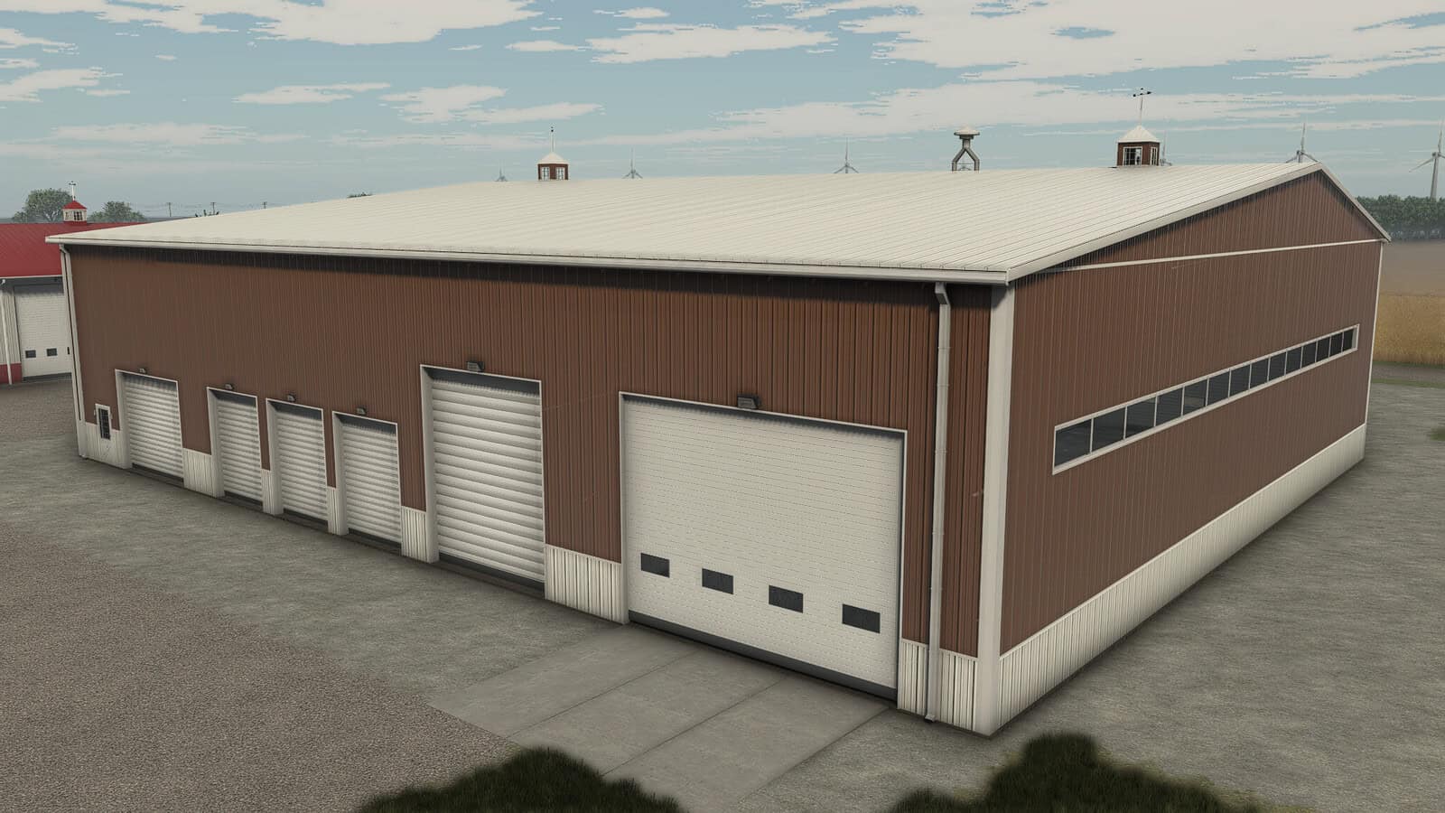American Midwest Machine Shop with workshop. Building has roller doors, large hydraulic doors and person doors. Here You can store grains, pallets and vehicles and them repair, sell or customize it. It has full lightning inside and outside manual and automatic nightlights above every person doors. Middle metal part of hall with color options.