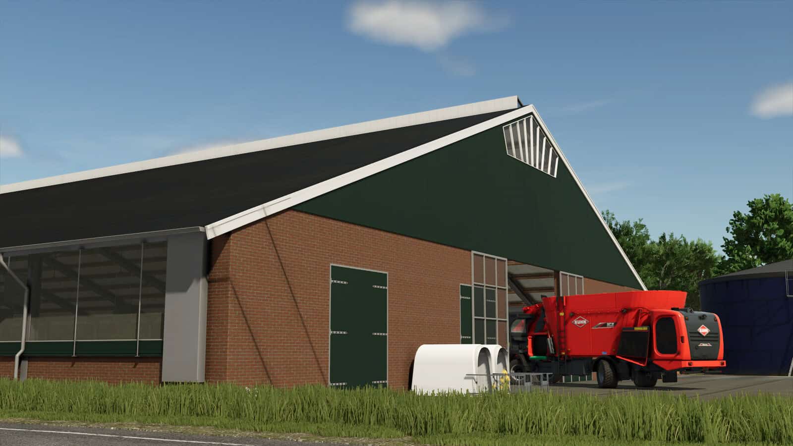 Free-stall barn for 200 cows. Feeding is possible in the middle of the cowshed. Adding straw can be done in the middle of the stable near the frontdoor (MilkTank side). Animals can be delivered using the doors at the right front of the building.