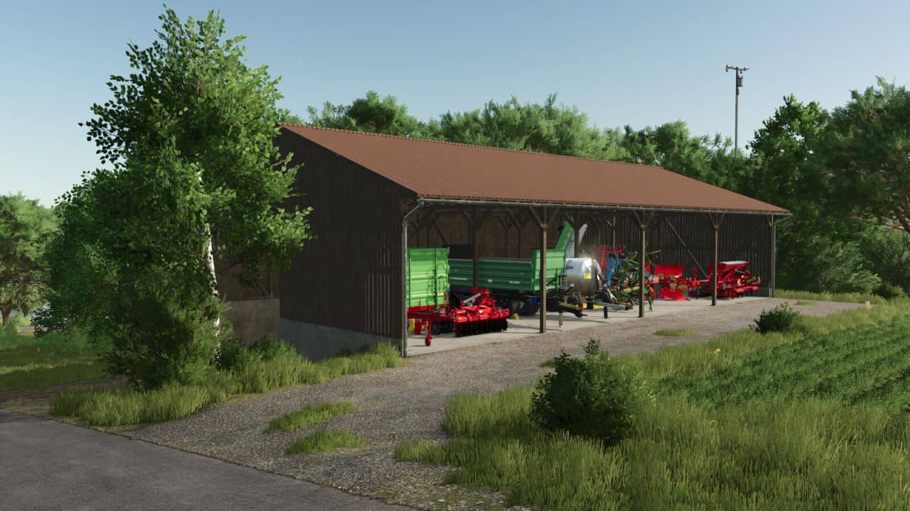 This building consists of a bunker silo and a slightly higher shelter for vehicles and machinery. The mod also includes a variant of the building where the actual bunker silo can be used as a wood chip storage.