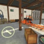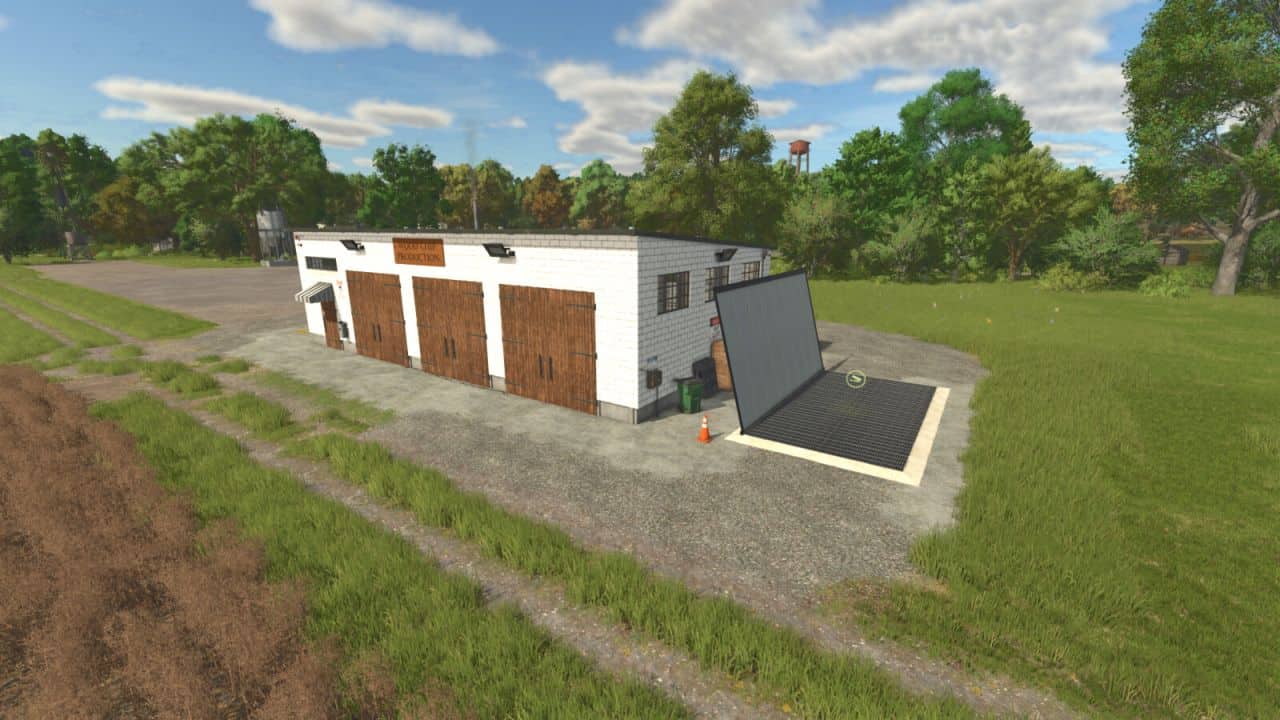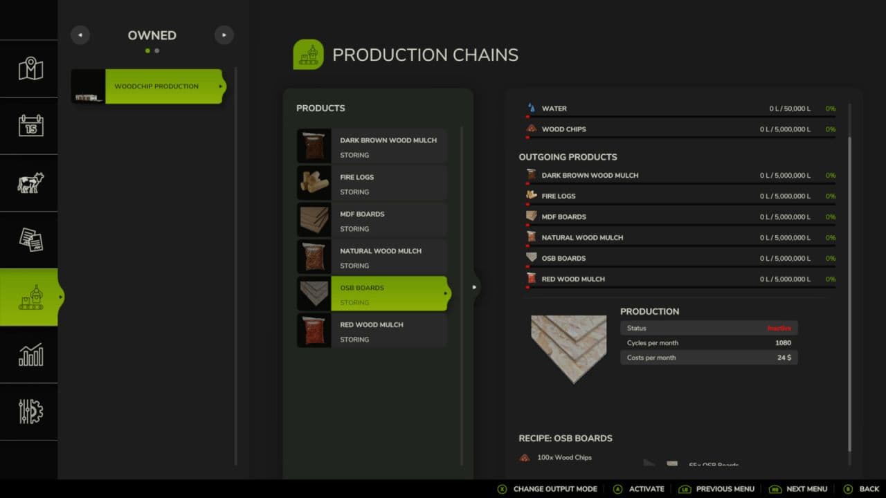 A production for using wood chips to make six new products: fire logs, MDF boards, OSB boards, and three types of wood mulch natural, dark brown, and red. All products can be sold at any selling point. There is an area to unload logs and trees to be made into wood chips marked by a warning strip in front of the building with the trigger just inside the doors. At the back of the building, there is a loading pipe to take the wood chips out in bulk with a trailer.