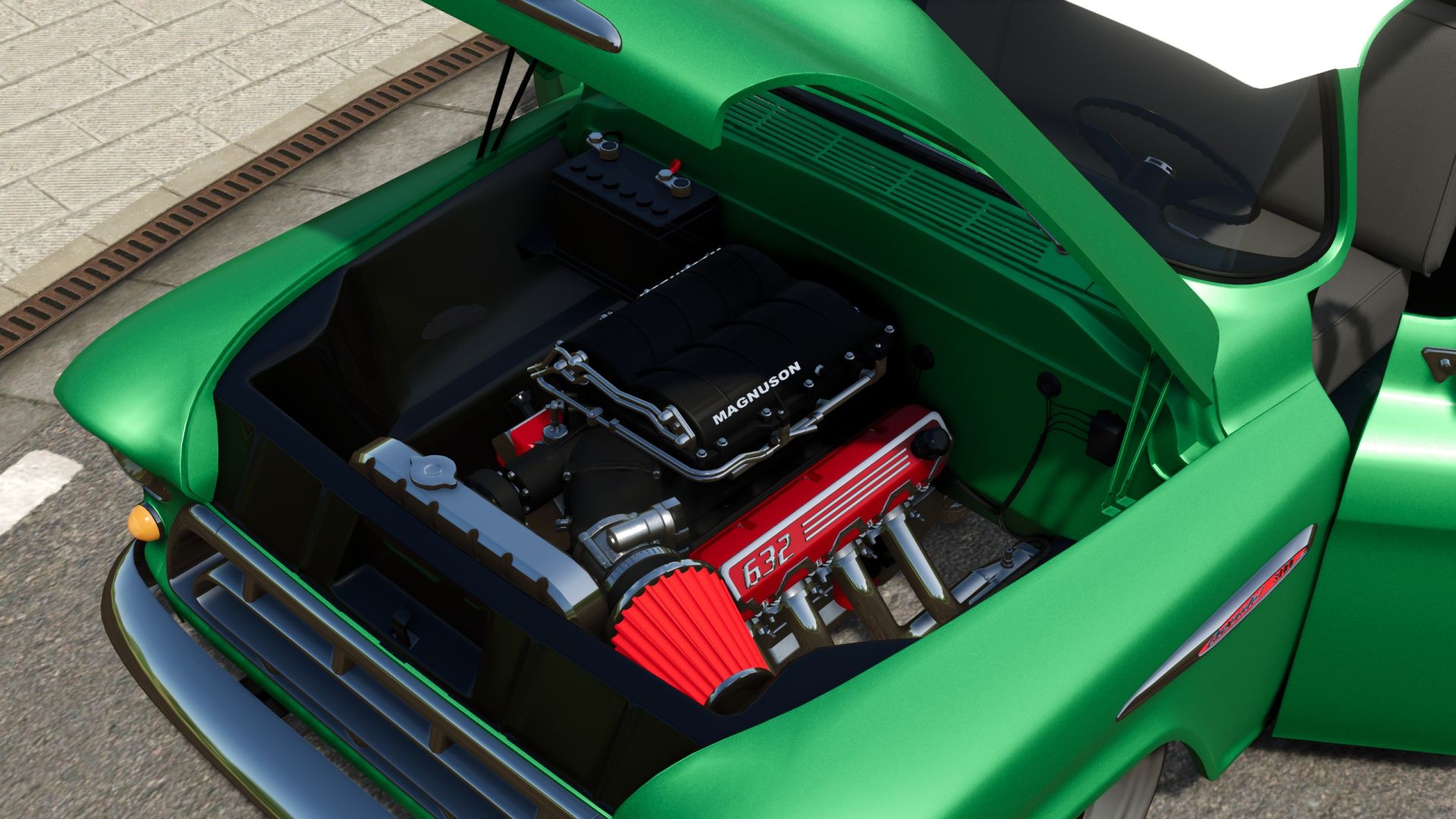 The Chevy 3100 is an old pick-up truck coming straight from the year 1957. Retrofitted with a powerful modern V8 with a Magnuson Supercharger, and with it’s vast choice of colors and decals, rest assured you will have a unique, one-of-one, powerful work beast, ready for whatever task you might have.
