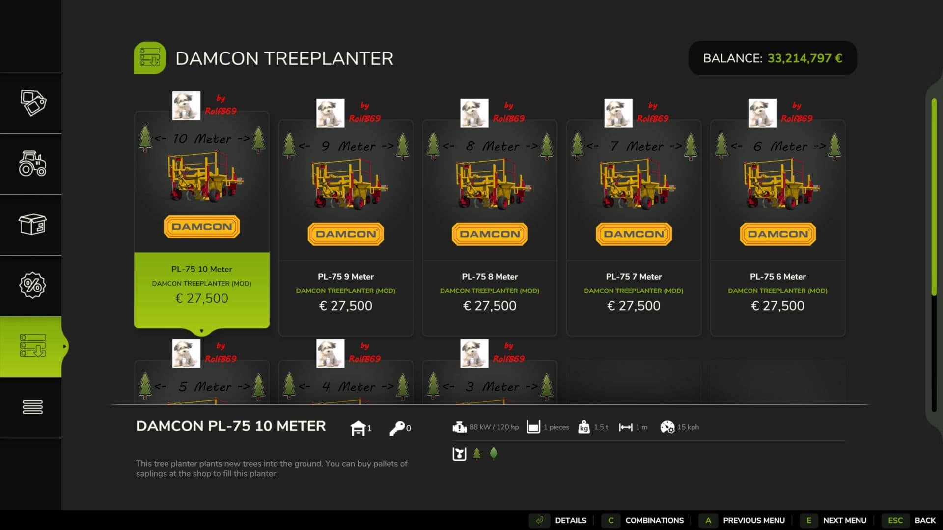 The standard device of the game has been modified into 8 variations with different planting distances from 3 to 10 meters. In addition, the working speed is increased. This means that it is now possible to obtain more yield from a wooded area.