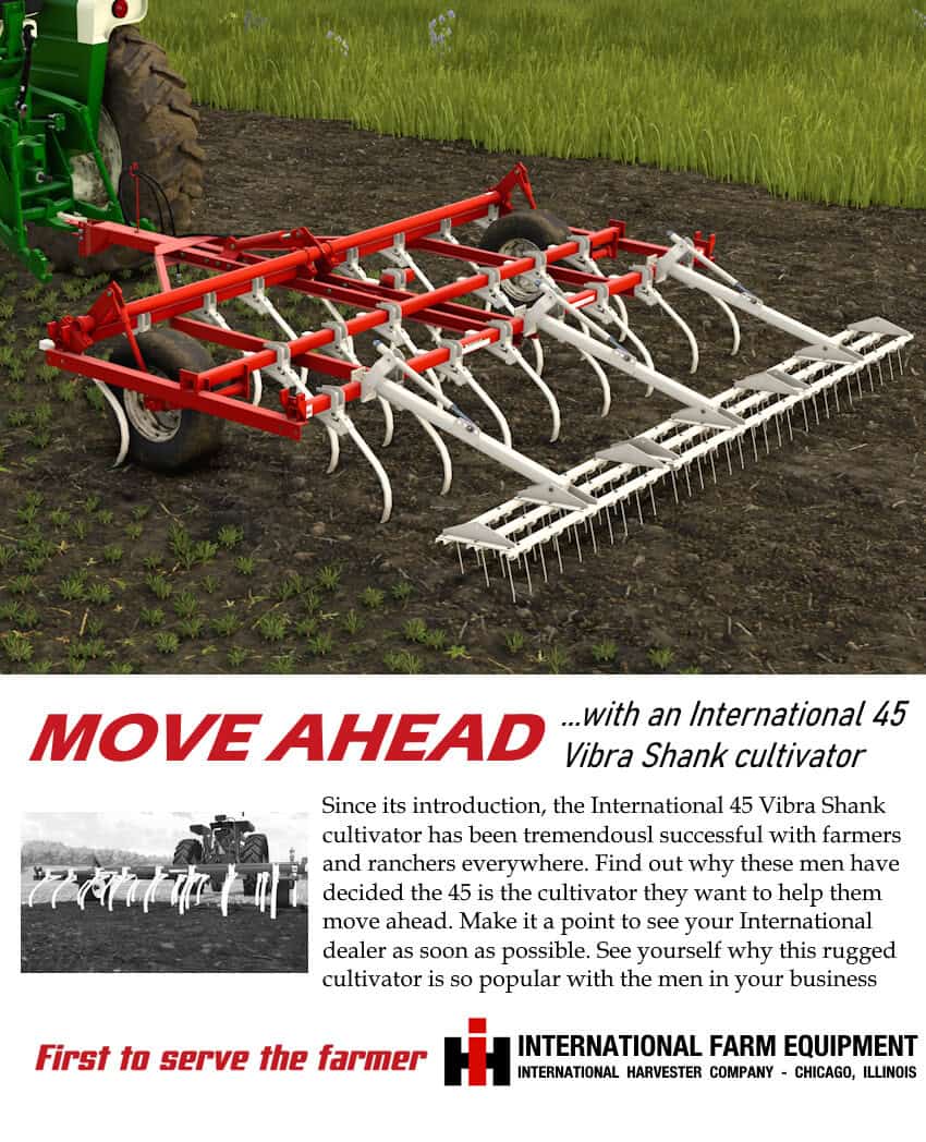 The International 45 Vibra Shank trailed cultivator with vertical vibrating shank action, plus exceptional trash clearance make the 45 Vibra Shank cultivator a real profit maker. Use it to kill weeds, summer fallow, renovate alfalfa fields, and prepare seedbeds in previously worked soil. It also conserves moisture and controls erosion