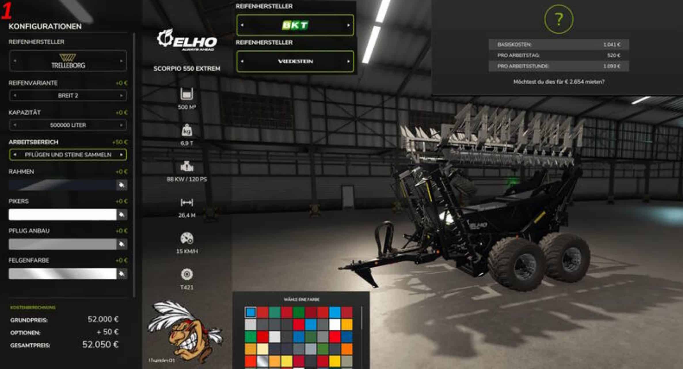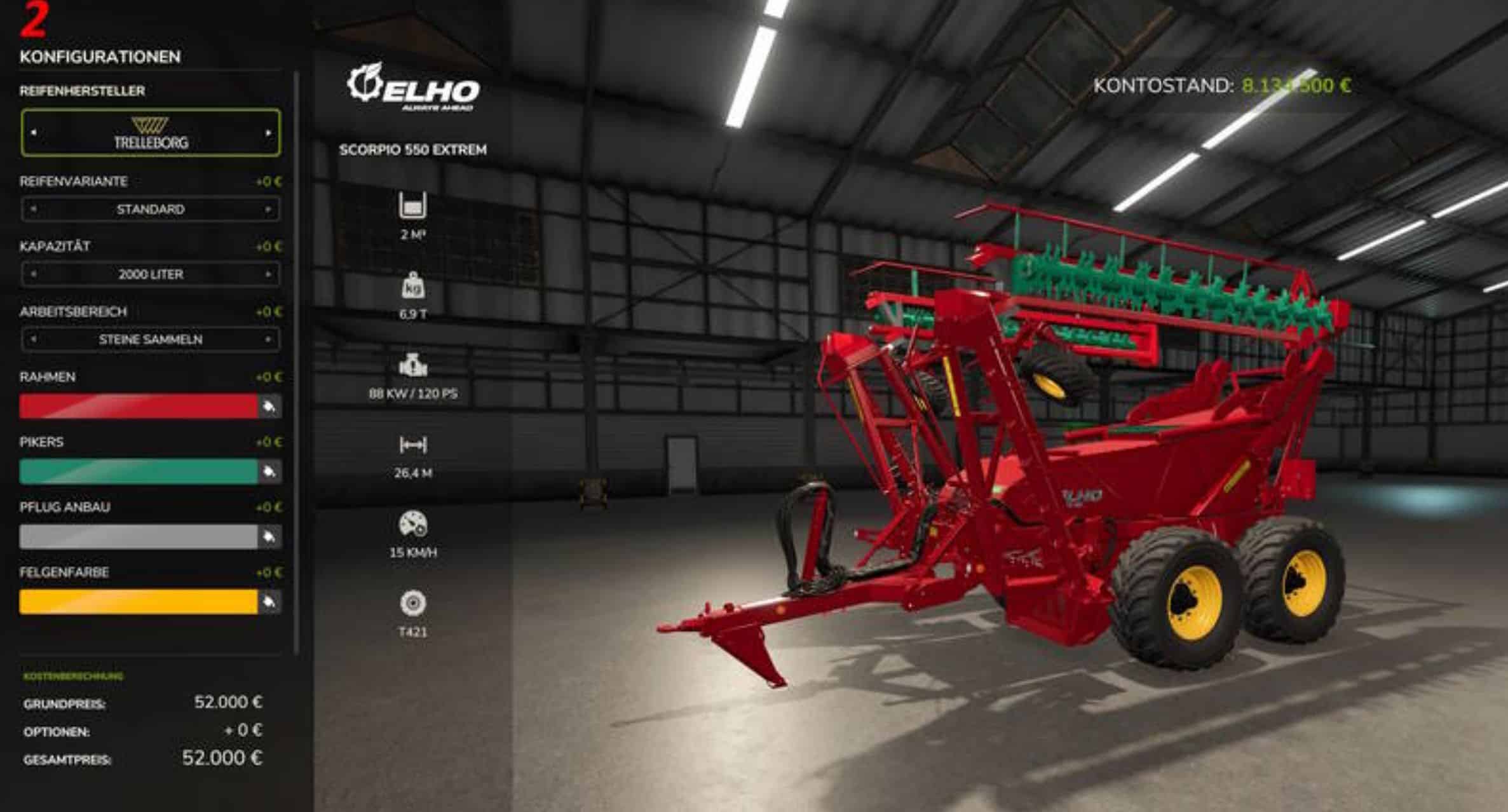 Moin moin, here is my Elho from the Ls19 brought into the Ls25 for you! It is the Elho Scorpio_550 Extreme! What is all made working width 26.4 meter, bunker volume from 2000l to 500000 liter extended as configuration! Then tires from normal to wide, wider! And of course colors until the well you know grin but see pictures so let off steam! And you can plow with him or pick up stones!