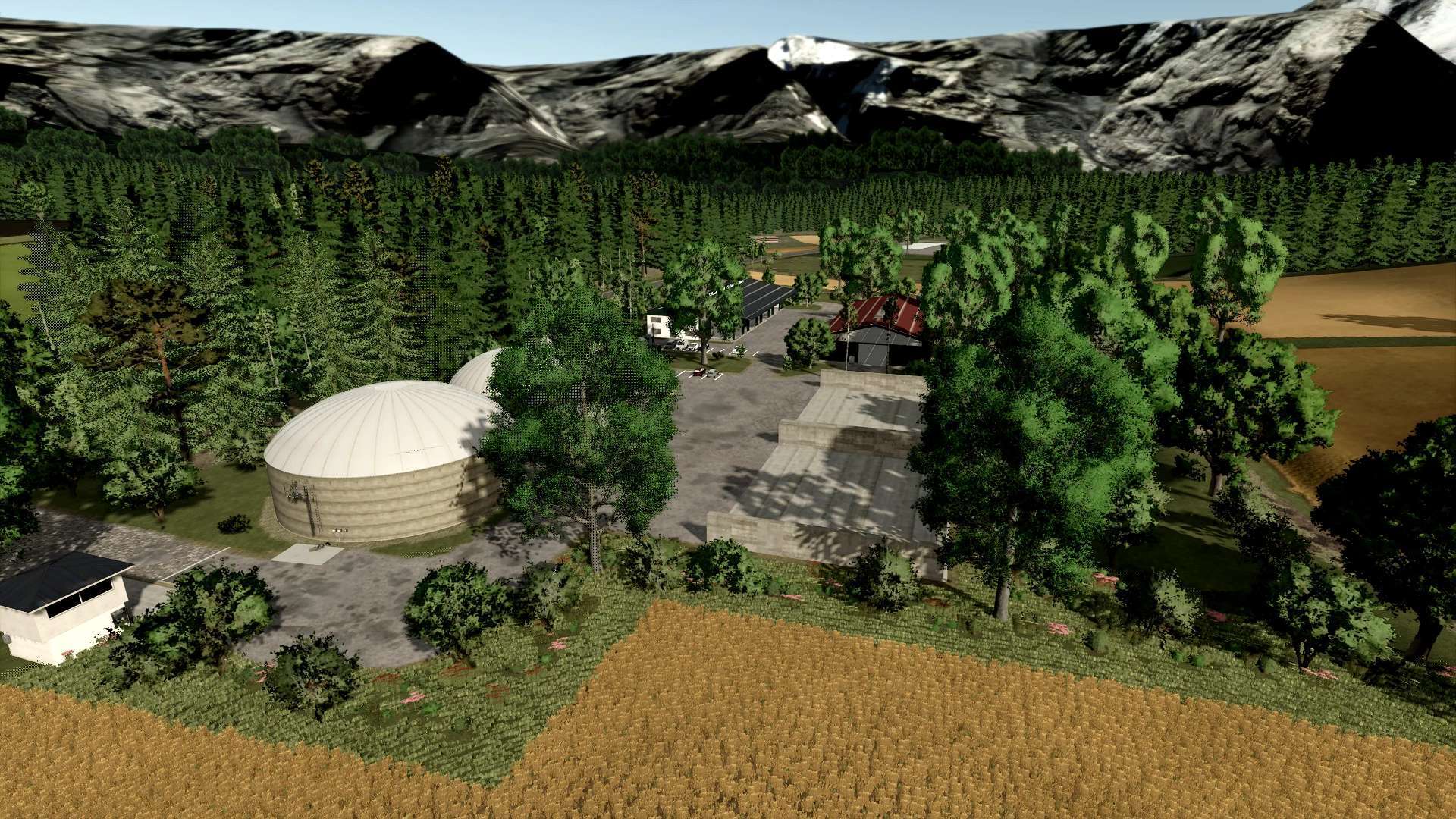 In the Alpine Foothills map, 8 different farms await you, along with a few additional shelters and a cowshed that can be purchased.