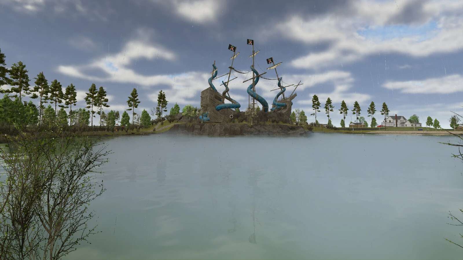 – Sheds have gutter and downspouts with water affect when raining