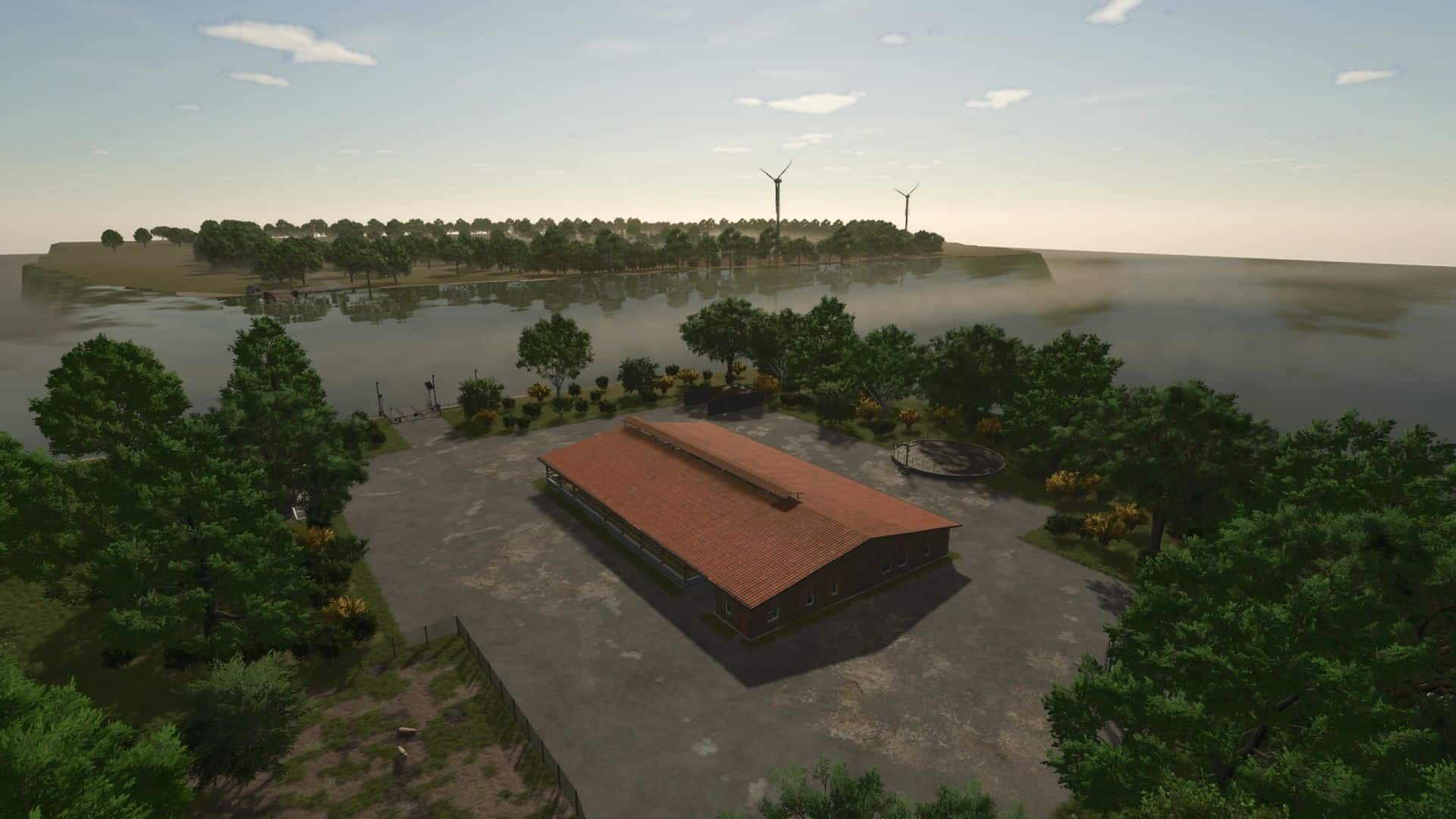 19 arable fields, 6 meadows, 2 farms, farm 1: stable, multi-fruit silo, greenhouse, rolling silo and 3 shelters, farm 2: 2 cow stables, 2 shelters, farm, multi-fruit silo, 2 road silos, 2 points of sale, 1 production (dairy). You can take a ferry to another island where the cattle dealer is located.