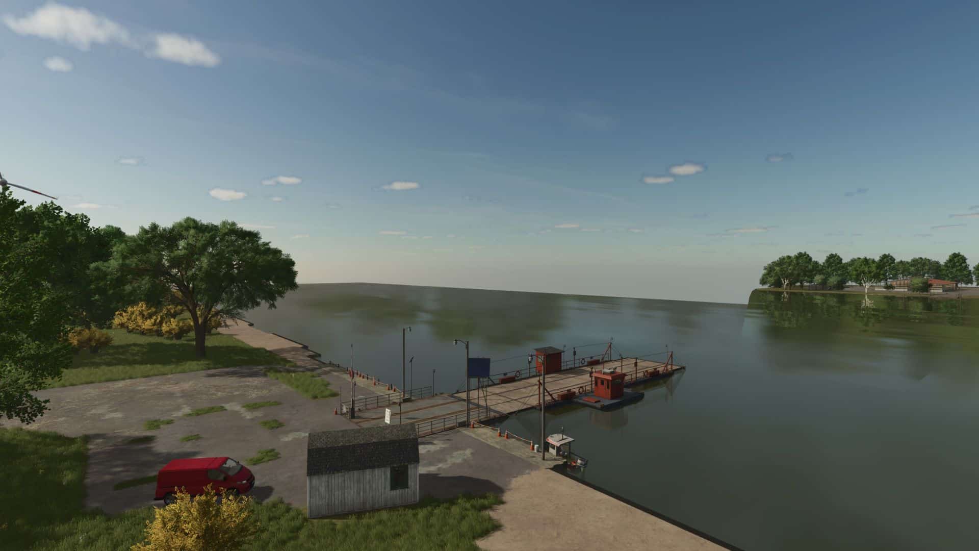 19 arable fields, 6 meadows, 2 farms, farm 1: stable, multi-fruit silo, greenhouse, rolling silo and 3 shelters, farm 2: 2 cow stables, 2 shelters, farm, multi-fruit silo, 2 road silos, 2 points of sale, 1 production (dairy). You can take a ferry to another island where the cattle dealer is located.