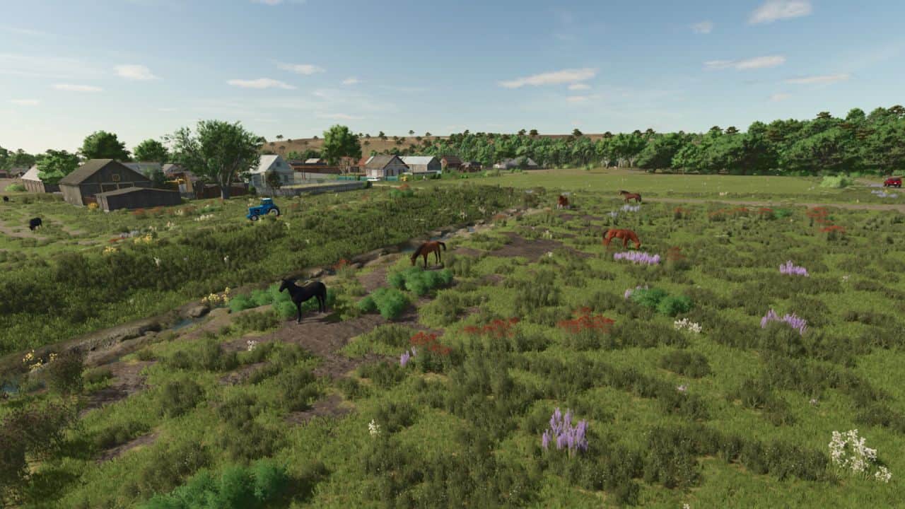 Krasnaya Polyana translation Red Field. This map features a rural village landscape based on a real-looking area in the Ural region of Russia. The village has approximately 500 inhabitants. There are no pre-built factories or industrial complexes—only the essential village structures are included. The map is designed for classic agriculture and traditional field work. However, there is plenty of space for players to place their own additional buildings or production chains.