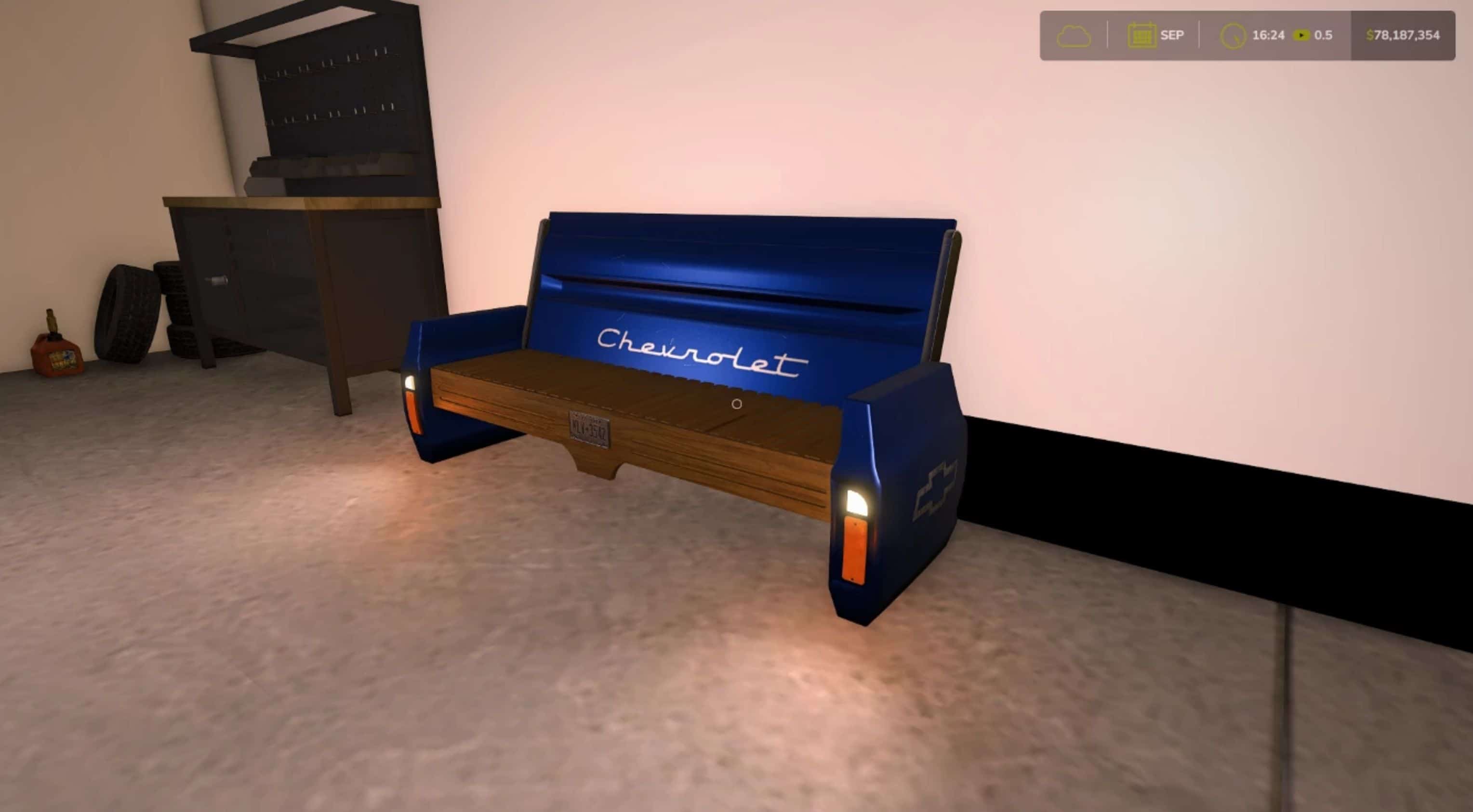 A placeable Chevy bench used for decoration. There is a trigger to turn on and off the brake/reverse lights.