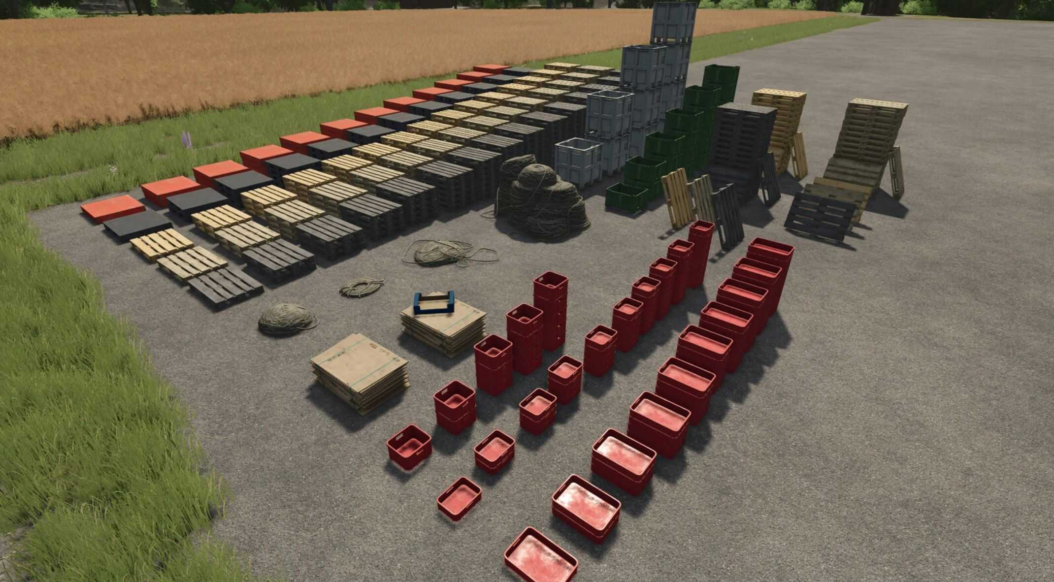The pack include different types of stacked pallets and crates, ropes and cardboards.