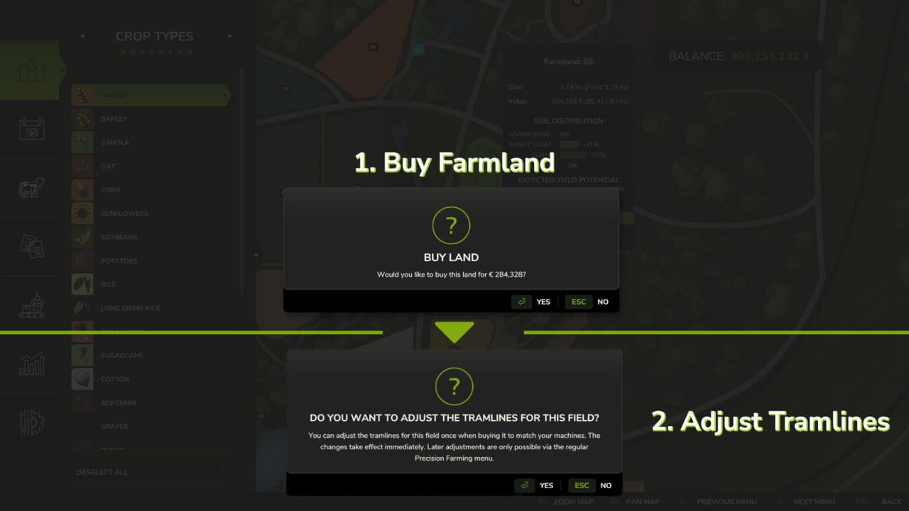 When purchasing a field, it is also possible to make a one-time adjustment of the tramlines to match your own machines. This change takes effect immediately. Later adjustments are still possible via the regular Precision Farming menu, but without immediate effect, but according to the usual handling of Precision Farming.