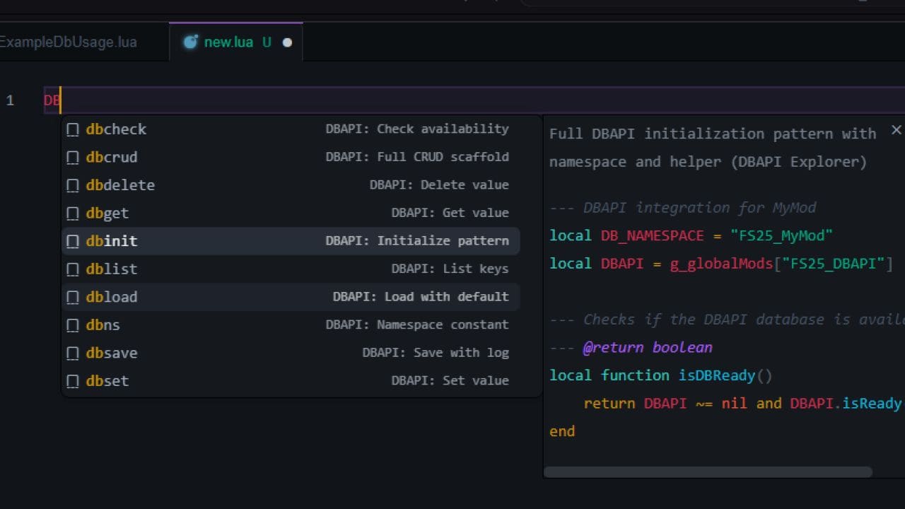– local DBAPI = g_globalMods[“FS25_DBAPI”] – local speed = DBAPI.getValue(“MyMod”, “config.playerSpeed”, 10)