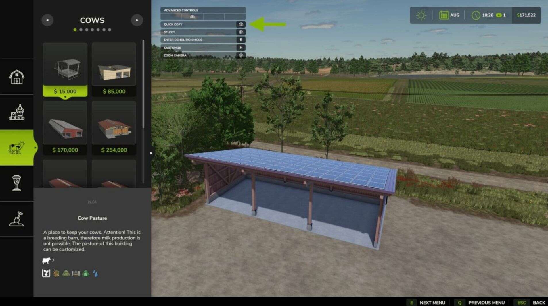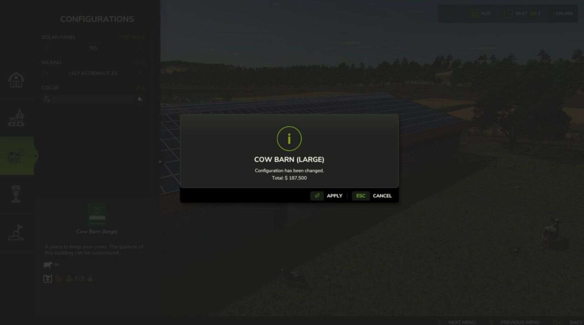 Short of cash when you placed that barn and left wishing you could change the configuration to include solar panels now you have the money? This is now possible from the construction screen by highlighting a configurable building and pressing the ‘Configure’ input binding.