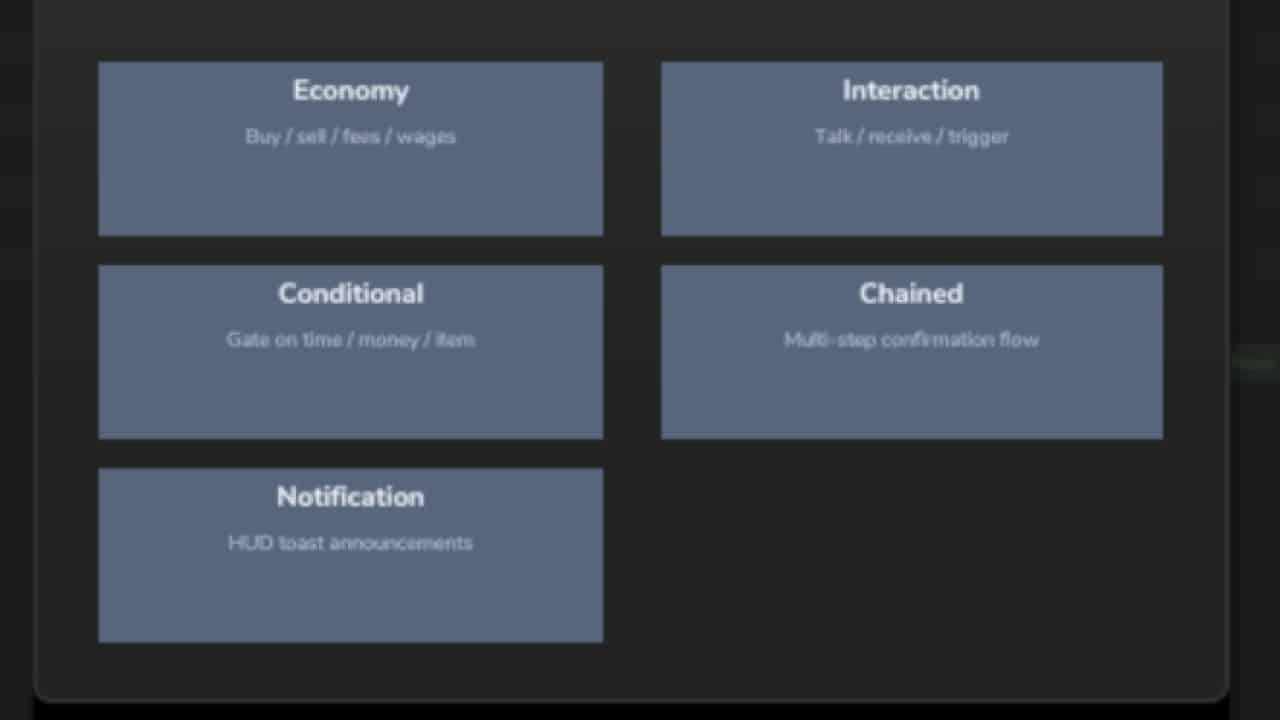 Using an easy step-by-step in-game wizard, you can create triggers for things like buying or selling items, paying fees, showing notifications, running events, or creating multi-step trigger chains. Everything is configured from a simple menu opened with F8.