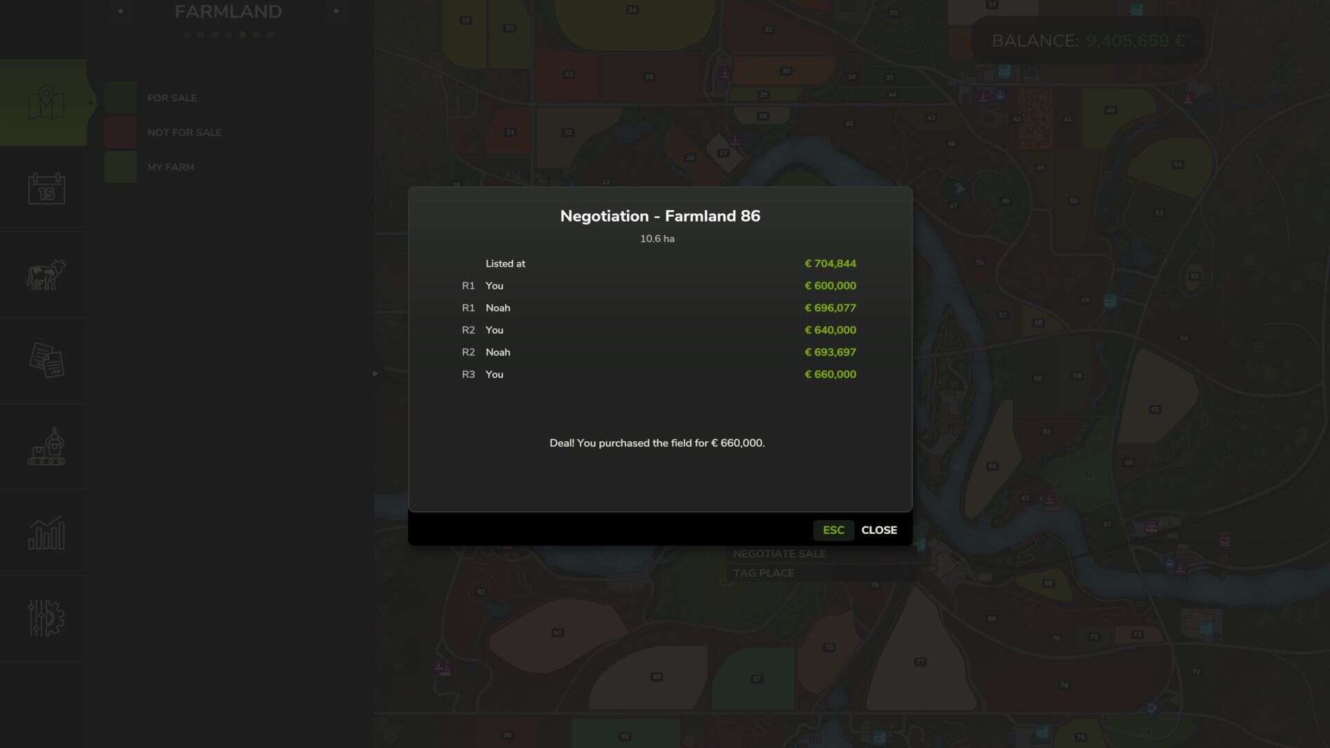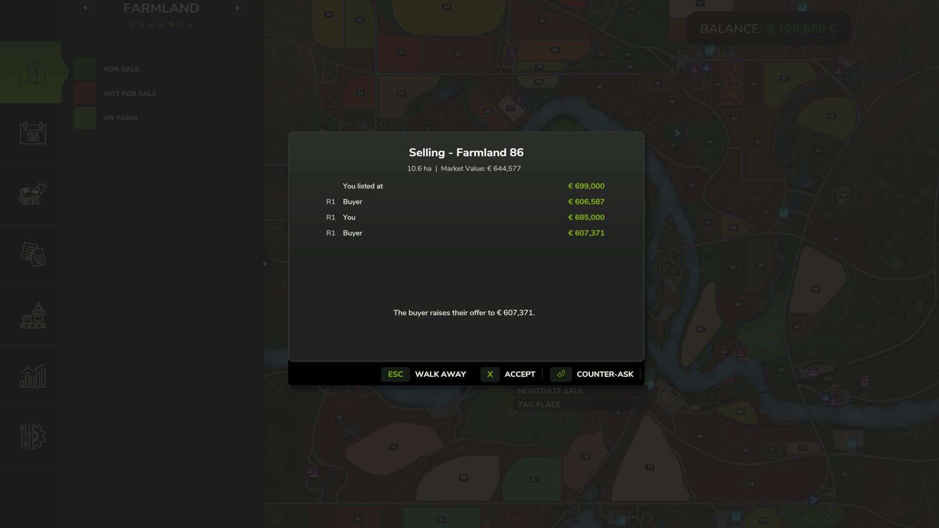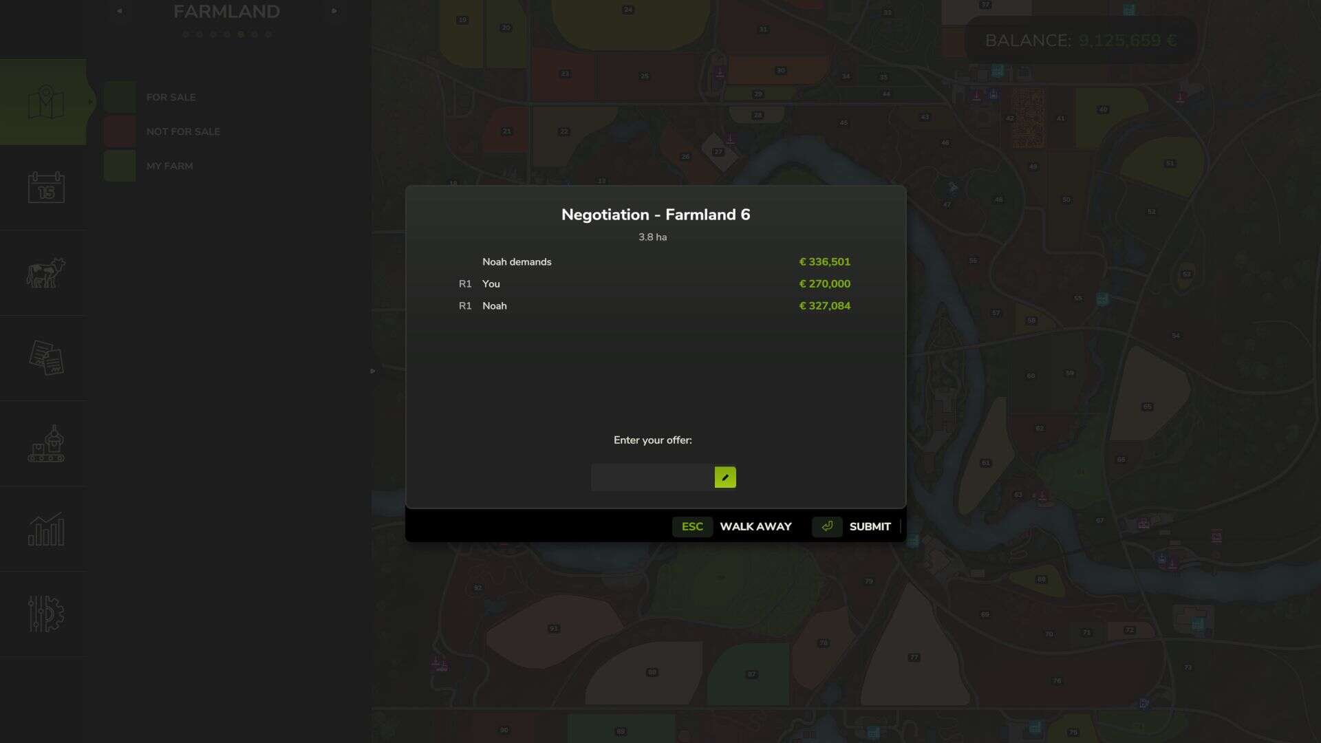 – Negotiation system – buy and sell farmland through offers and counter-offers