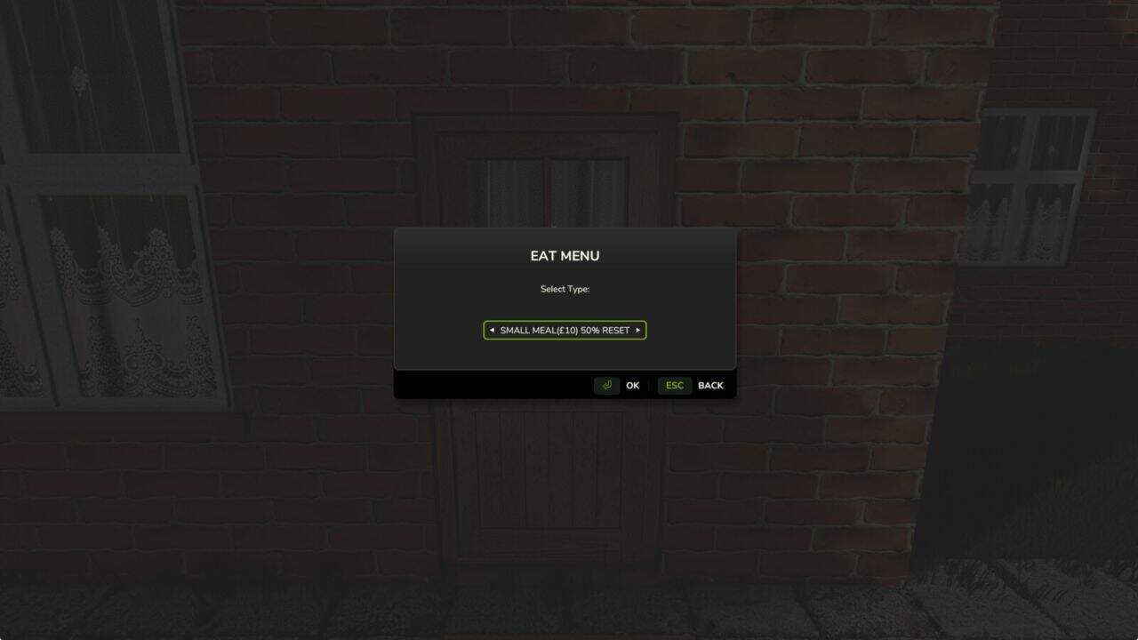 – Eat menu (Full meal / Small meal / Light snack) with difficulty-based cooldowns