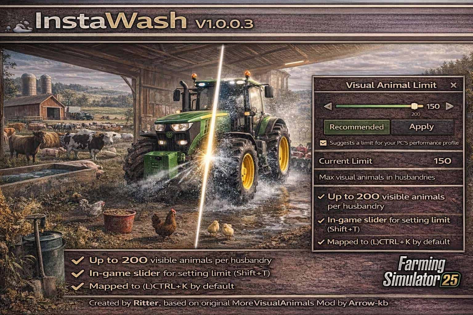 Finding a game interesting after investing 300 hours into it can become a bit challenging. But with mods as long as there is a new update is assured, you are guaranteed a few more hours of new exciting gameplay. FS 25 Other Mods are one of the greatest upgrades and can make your game unique. Downloading and adding FS25 InstaWash Rodd v1.0.0.3 Mod to your game is not difficult at all - you simply need to save a file and run it.
