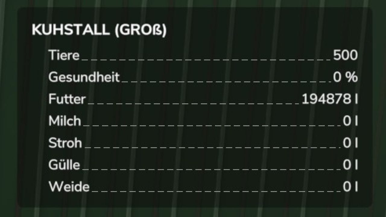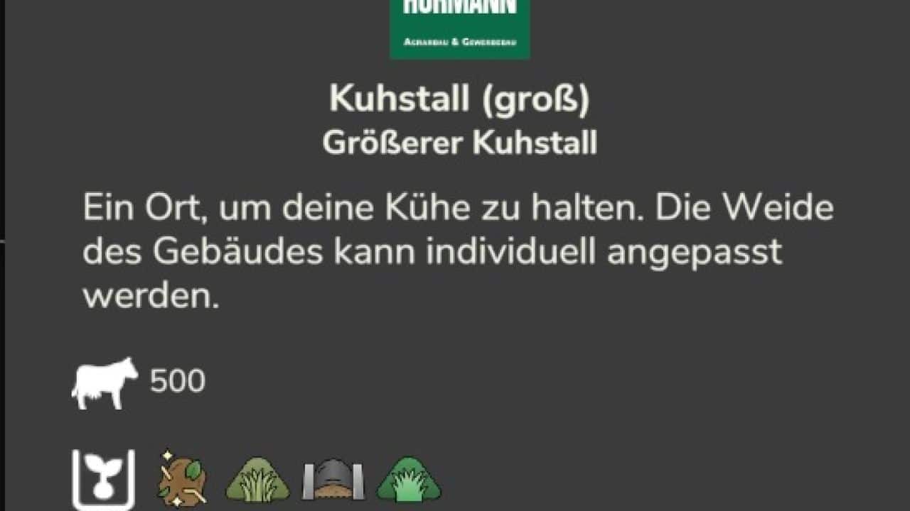 It is the standard cowshed with a higher capacity for cows (the large and medium cowshed, the cowshed with the feeding robot will be delivered later). Of course, the capacity for feed, milk and manure was also adjusted. It is NOT allowed to upload this mod elsewhere without my consent. I also own the copyright to this mod and may not change it.