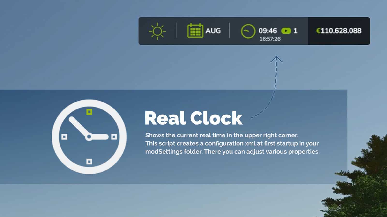 Shows the current real time in game, default location is below the ingame clock.